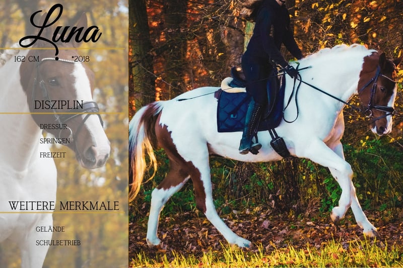Luna ist eine 2018 geborene Stute ca. 162cm *Luna* ist eine wunderschöne Allrounderin. Sie ist schön zu reiten und zeigt sich mit schönen Bewegungen, die super zu sitzen sind. Luna geht brav alleine und in der Gruppe ins Gelände, ist total unerschrocken und cool. Im Wasser hat sie Spaß und auch das Gelassenheitstraining macht sie entspannt mit. !!! SCHAUEN SIE SICH UNBEDINGT IHR VIDEO AN !!! Eine tolle Allrounderin die bei allem Freude macht. Ein aktuelles Video finden Sie hier in der Anzeige oder unter folgendem Link: https://www.youtube.com/watch?v=d_yhBhyeukg Pferdehandlung Dederichs – Ihr Partner für den Pferdekauf Kontakt & Erreichbarkeit: Anfragen bitte ausschließlich telefonisch unter 0173/9792139 Montag – Freitag: 09:00 – 18:00 Uhr Samstag: 09:00 – 15:00 Uhr Sonntag: Ruhetag Folgen Sie uns auf Social Media! Erleben Sie unseren Alltag mit den Verkaufspferden auf Instagram, TikTok & Facebook unter Pferdehandlung Dederichs Rabatt: Bei sofortiger Mitnahme Ihres neuen Traumpferdes erhalten Sie zwischen 5 %– 10 % Rabatt Probereiten & Vorführen: • Probereiten: 30 € pro Pferd (max. 2 Reiter), Betrag wird beim Kauf angerechnet • Feiertage: Proberitt 50 € • Vorführung durch unsere Bereiter: 25 € pro Pferd (Vorreiten, Bodenarbeit etc.) Ankaufsuntersuchung & Transport: • Viele unserer Pferde besitzen bereits eine AKU • Sie können selbstverständlich Ihren eigenen Tierarzt mitbringen • Gerne organisieren wir eine Untersuchung • Wir unterstützen Sie auch gerne beim Transport ins neue Zuhause Weitere Verkaufspferde: In unserem Stall stehen weitere Verkaufspferde, die noch nicht online sind. Falls Ihr Traumpferd noch nicht dabei ist, zögern Sie nicht, uns zu kontaktieren. Wichtige Hinweise: • Stockmaß-Angaben sind geschätzt und nicht exakt nachgemessen • Alle Beschreibungen sind subjektive Einschätzungen des Verkäufers und keine zugesicherten Eigenschaften Weitere Informationen finden Sie unter: www.Pferdehandlung-Dederichs.de
