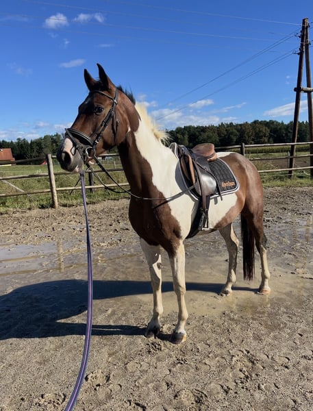 Beautiful Pinto – Dark Brown Overo – approximately 158 cm For sale is a Pinto (height approximately 158 cm), a stunning dark brown overo, already well-ridden and ideal for junior riders. The horse is 5 years old, motivated, and enjoys working, but requires a rider with experience as it is still in training – not suitable for beginners. Home before price – a suitable, loving home is our top priority. Price is negotiable. Trial riding possible by prior appointment. A versatile, beautiful partner for experienced riders looking to further develop a young horse. We look forward to your inquiry.
