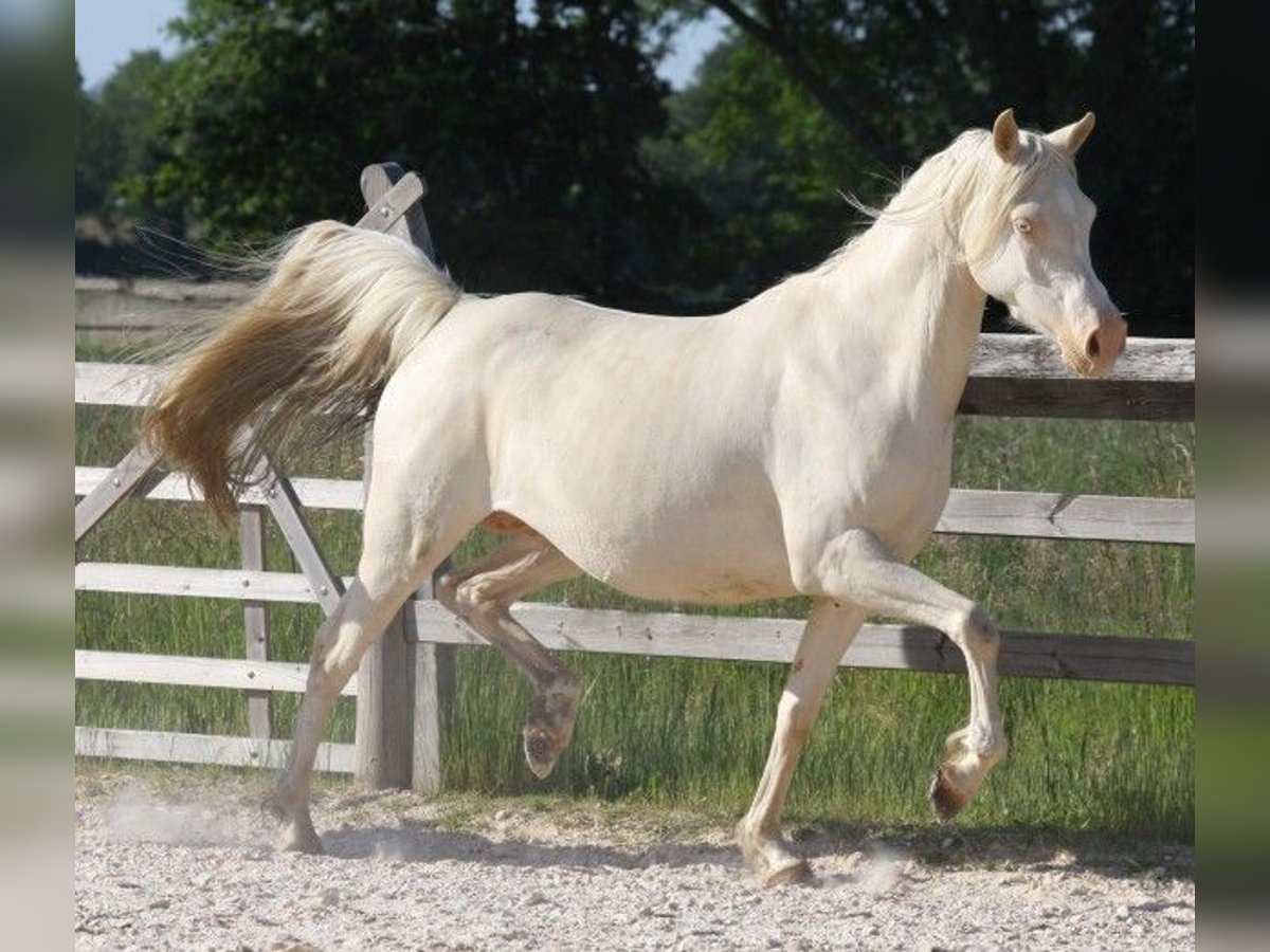 FRANCE, a stunning half-bred Arabian mare with 75% Arabian blood, in a beautiful cremello coat. An excellent broodmare with superb bloodlines. Not yet broken but could be easily trained. Her performance origins include show jumping and endurance disciplines. Photos show her father, a palomino, and additional pictures of her offspring are available. Located in France. A fabulous cremello half-bred Arabian mare, 75% AR, very promising as a broodmare—her foals will be 100% color. Unbroken but easily trainable. Very nice mare. Photos and videos of her foals are available.