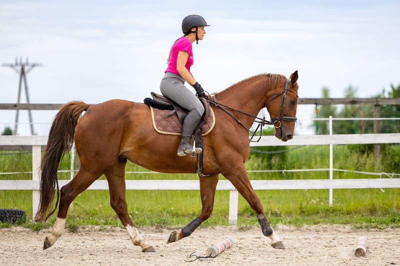 Na sprzedaż piękna klacz Wielkopolska. Klacz ma cudowny charakter, nada się zarówno dla osoby początkującej jak i zaawansowanej. W treningu od wiosny, bardzo dobrze pracuje na lonży, chodzi w tereny, przygotowana na pierwsze starty w zawodach. Bardzo wygodna, jezdna, jest koniem chętnie, równo idącym do przodu. Nie przeszkadza jej przerwa w treningu, koń typu „wsiadasz i jedziesz”. Ma za sobą treningi wyjazdowe, na których zachowuje się jak w domu. Jeździ bezproblemowo przyczepą. Klacz posiada licencje hodowlana, daje piękne źrebaki. Jej ojciec to francuski ogier Bayard D’Elle chodzący konkursy do 160 z sukcesami. (Ostatnie zdjęcie) Zdrowa, kuta na przody, aktualne czyste RTG do wglądu, szczepiona, odrobaczana, regularnie roczyszczana. Zapraszam do kontaktu w celu uzyskania dodatkowych informacji i umówienia się na jazdę próbną!