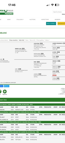 Una hermosa potranca de color chocolate busca un nuevo hogar. Este caballo tiene potencial para ser un futuro ejemplar de concurso completo, caza, cross o salto debido a su pedigrí y su excelente movimiento. El padre de Leblanc es el semental leopardo Perfekt Love (Love Affair # Treflowa Dama), que ha logrado éxitos en salto, como se muestra en la última foto. Love Affair (nivel 150 cm) es un semental de primera clase de Hannover, nacido en Alemania, con un pedigrí destacado en salto y doma. Su padre es el semental inglés de pura raza Lauries Crusador, reconocido por producir caballos con excelente movimiento y predisposición atlética, y su madre proviene de una línea que da caballos tanto para salto como para doma. Los descendientes de Love Affair han ganado numerosos campeonatos en Polonia, tanto en potrillos como en el Campeonato Polaco de Caballos Jóvenes en doma. Sus crías se distinguen por su conformación armoniosa, belleza, movimiento fenomenal y excelente carácter, lo que los hace ideales tanto para salto como para doma. Love Affair es un semental cuyas genes garantizan potencial, belleza y temperamento, y sus descendientes continúan la tradición de criar caballos sobresalientes en atletismo y carácter. La madre proviene de las mejores líneas de árabe-ingles (Efekt (nivel 145 cm) - Lozanna / Huzar / Jalenny AA). Semental: Huzar - Vicecampeón polaco de caballos de 4 años en concurso completo 3er puesto en el Campeonato Polaco de caballos de 4 años en salto 7º lugar en CIC* Strzegom (2010) 5º lugar en CIC* Jaroszówka (2011) 6º lugar en CIC** Sopot (2011) Campeón del Mundo para Caballos Jóvenes en Le Lion d’Angers (2010) 2º lugar en CIC* Biały Bór (2013) 5º lugar en CCI** Sopot (2014) 10º lugar en CIC*** Baborówko (2015) Medalla de bronce en el Campeonato Polaco de Adultos CIC*** Sopot (2015) La potranca es extremadamente correcta, con patas rectas y fuertes, y cascos adecuados. Tiene una naturaleza muy pro-humana y encantadora. Criada en amplios pastos y ejercitada a diario, actualmente corre en el paddock con un grupo de jóvenes. Se alimenta con pienso de alta calidad. Si llega a ser una yegua de cría, podría producir descendencia leopardo. Muy bien educada, camina con la cuerda, está vacunada, desparasitadas, etc. Es valiente y está familiarizada con perros, gatos, tractores, etc. Altura estimada: aproximadamente 166-168 cm. Pasaporte de Caballo de Deporte Polaco. Precio + 8% IVA. Ubicada en Polonia, cerca de la frontera alemana. Se puede gestionar transporte. WhatsApp +48 513 179 245