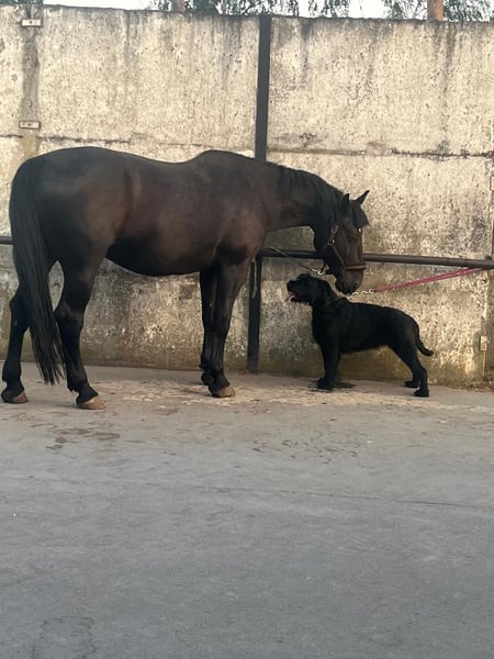 1ª raza: warmblood polaco 2a edad: actualmente 10 años (cumplirá 11 este año) 3. color: negro 4. nivel de entrenamiento: doma E/A 5. fácil de cargar y forjar 6. (herrado por delante) 7. sin enfermedades mentales/físicas 8. actualmente está en el paddock con otros caballos durante el día y en el box por la noche -> Compatible con todos los caballos 9. no muestra ningún mal comportamiento como montar, corcovear, morder, etc. cuando es montado y manejado 10. sabe montar en picadero, arena y campo a través (va bien solo o en grupo) 11. tiene un carácter relajado y bonachón, siempre se le puede controlar, no se sale con la suya su "propia cabeza 12. también apto para principiantes