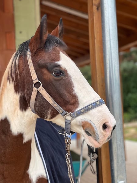 16-jähriger Wallach (2010), polnisches Warmblut (Schecke), mit guter Abstammung (Vollblut x Trakehner). Im ersten Moment ähnelt er einem Quarter Horse was sicherlich auch an seiner Färbung liegt und dem kurzen Körperbau. Er ist Ausdrucksstark, solide gebaut und feinfühlig im Umgang. Brav, menschenbezogen. Unter dem Reiter aufmerksam, lernwillig und fein an den Hilfen. Nervenstark und trittsicher im Gelände, läuft gerne und kann auch Gas geben. Herdenverträglich, kein Beißen oder Schlagen, artig beim Hufschmied. Ideal als Freizeitpferd für feinfühlige Reiter. Benötigt Herdenhaltung mit Auslauf. Sucht aufgrund geänderter Lebensumstände einen neuen, passenden Menschen.