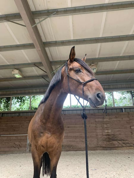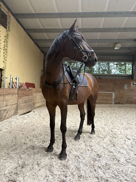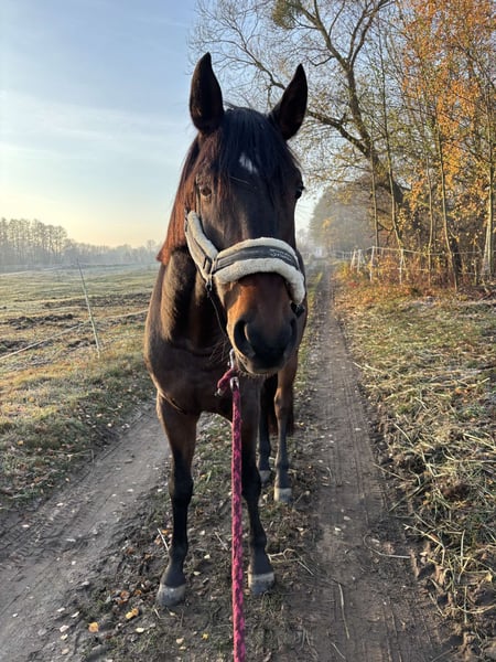 Handsome, well-built dark chestnut gelding sired by the stallion Love Affair – a horse of modern type with sporting potential. Approximately 16.1 hh, born on March 10, 2020. Castrated on April 9, 2024. TÜV examinations from March 2024. Temperamental and with character — not bucking or showing aggression, but requiring a confident, experienced rider who can work with horses of strong personality. Well-behaved during all handling (grooming, farrier, veterinarian). Preliminary lunged — accepted the saddle and rider, moves independently in walk, trot, and has begun cantering. Works on a lunge in all three gaits. Regularly exercised 3–4 times a week. Turned out in a small group of geldings. Healthy, vaccinated (including WZN), dewormed, teeth floated. For sale with a suitable saddle.