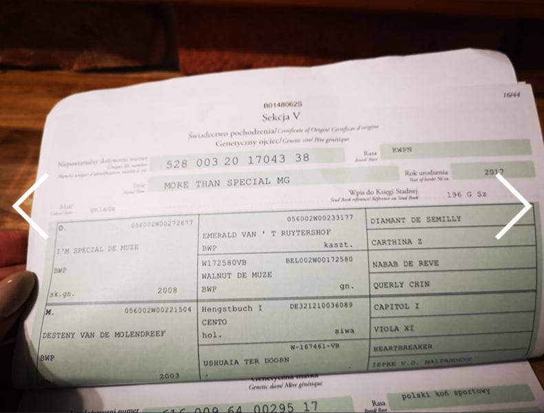FAMINA (08.04.2021, Mare, Sk.Gn. Sp.) In stalla è senza conflitti, va in giostra, è gentile durante tutte le operazioni, è stata montata nei tre andamenti. Molto stabile e con un grande potenziale per competizioni di alto livello. Conoscendola meglio, la cavalla dà tutto il suo cuore. Certificato attuale Tuv del 20.08.2025. Il prezzo aumenterà con le abilità del cavallo. Attualmente 168 cm (da More Than Special MG – I’m Special de Muze-Walnut de Muze da Nabab de Rêve, da Fortuna – Magnum van den Bisschop-Farma da Chacco Fly), proviene da una linea eccezionale di cavalli sportivi. Il padre della cavalla, More Than Special MG, compete a livello di 140 cm con Natalia Czernik. Dal lato materno, Famina proviene da una linea di cavalli di successo nello sport, tra cui Chacco Fly (160 cm), Fetysz (160 cm), Farmer (160 cm), così come Frakcja e Finezja, medagliate ai Campionati Polacchi di CCE. Posso inviare video su WhatsApp.
