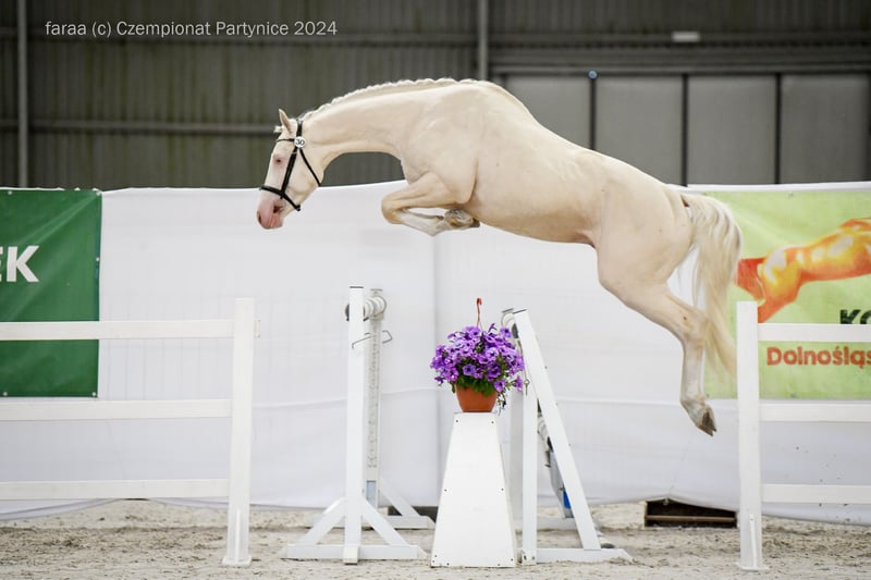 A beautiful, eye-catching 3-yo stallion (born 2022) polish sporthorse breed (no spanish lines). Very good movement and jumping technique - a promising sport and breeding prospect. Full brother to licensed stallion Diamond Dealer-J (OgierZoltar x Corleone Z) https://www.colored-stallions.com/diamond-dealer-j Sire Zoltar: https://www.colored-stallions.com/zoltar His mother Dita-P, is a daughter of the stallion Corleone Z, whose offspring perform very well in both disciplines: dressage and jumping. Dita-P's full sister mare Dirty Lady-P participated in the World Championships for 5-year-olds in dressage. Last photos dam and sire and 2 full brothers. Movies can be send on Whatsapp Also other palomino and cremello horses available. https://sites.google.com/grupadrewnex.pl/palominojaskulscy/strona-g%C5%82%C3%B3wna/foals-horses-for-sale Facebook @PalominoJaskulscy Located south-west Poland 55-093 Piecowice