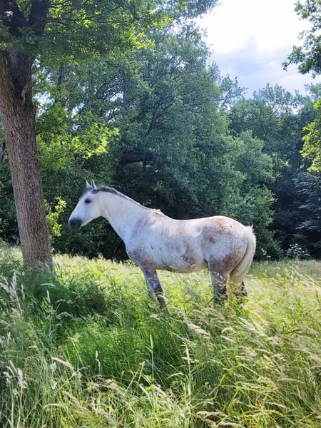 Casanova ist ein neunjähriger Schimmelwallach, der im Wesentlichen sowohl optisch als auch charakterlich einem polnischen Warmblut entspricht. Er ist menschenbezogen, charakter- und nervenstark, furchtlos, neugierig, arbeitswillig und will gefördert werden. Er kennt alles rund um Hof und Dorf, von Hunden, Katzen und Wild bis hin zu Traktoren, Landmaschinen und Fahrzeugen. Er zeigt sich gelassen und unerschrocken und ist Neuem gegenüber aufgeschlossen und neugierig. Er ist absolut schmiedefromm. Läuft derzeit barhuf, war aber auch schon voll beschlagen. Casanova kennt Halle und Gelände, wobei er die Arbeit und das Reiten im Gelände bevorzugt. Hierbei geht er problemlos alleine ohne Anstalten von der Herde weg und „klebt“ nicht. Er wurde bisher englisch und teilweise auch ohne Sattel geritten. Ich könnte ihn mir aber auch gut zum Westernreiten oder als Wanderreitpferd vorstellen. Er kennt die Boxenhaltung, stand aber in den letzten Monaten im 24/7 Offenstall zusammen mit 3 Stuten. Hierbei zeigt er sich mit anderen Pferden sozial verträglich, da er sich zwar „zur Wehr setzt“, von sich aus aber keinen Konflikt sucht und eher gelassen bleibt. Futter und frisches Grün sind für ihn interessanter, als Machtgehabe und Rangkämpfe. Casanova ist nicht für Kinder oder Anfänger geeignet, da er ein charakterstarkes Pferd ist, das neuen Personen gegenüber zu Beginn etwas skeptisch sein kann. Hier testet er auch mal vorsichtig aus und nimmt dabei auch mal die Ohren nach hinten, merkt aber schnell, wenn er damit nicht durchkommt oder man es einfach ignoriert, dann hört er auch schnell wieder auf. Daher benötigt er eine erfahrene Person, die ihm mit liebevoller Strenge, Zeit und Vertrauen die nötige Sicherheit gibt. Hat er diese, ist er gut zu händeln und ein toller Partner und Freizeitkumpel, der menschenbezogen ist und beim Geräusch des Automotors direkt angelaufen kommt, um ausgiebig geschubbert und gekrault zu werden. Da ich diese Zeit leider nicht habe, muss ich mich schweren Herzens von ihm trennen und wünsche ihm das tolle zu Hause, das er verdient hat und wo er sein Potenzial voll entfalten kann.