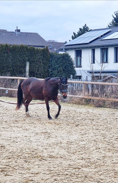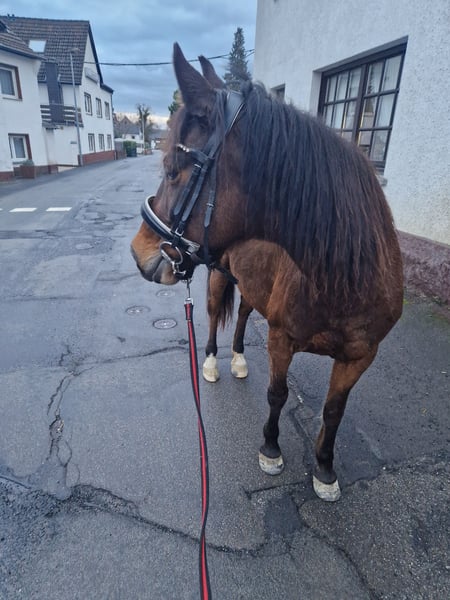 In unserer Elly steckt ein ganz tolles Pony - es benötigt allerdings etwas Zeit und Vertrauen dies herauszukitzeln, denn sie sagt erstmal zu allem nein, ist unsicher und fremde Menschen sind erst recht blöd. Gibt man ihr genügend Zeit, Sicherheit und konsequent Regeln vor, ist sie gut zu händeln - auch von erfahrenen älteren Kindern. Sie ist sehr lernwillig bei der Bodenarbeit, beim reiten sehr fein an den Hilfen. Sie bringt bei beidem etwas "go" mit. Im Gelände zeigt sie sich mit viel Routine entspannt - nur vor LKW's, Treckern oder großen Anhängern hat sie Angst, das kann man aber sicherlich sehr gut mit ihr üben. Elly ist sehr rangniedrig und kennt 24/7 draußen sein, sowie Nachts Box. Beim Hufschmied zeigte sie sich bisher immer brav und kooperativ und auch das verladen und Fahren zu uns ging ohne Probleme. Sie ist ungefähr 10 Jahre alt und 1,40m groß Leider müssen wir der süßen einen neuen Platz suchen, da sie durch den Reiterwechsel in der Reitpädagogik massiv gestresst ist. Ein Handycap bringt sie leider noch zusätzlich mit: als wir Elly im Sommer 2025 übernommen haben, teilte uns unser Hufschmied mit, dass sie wohl 2024 mal Hufrehe hatte - uns wurde leider dazu nichts mitgeteilt. Bei der Vorbesitzerin stand sie ganztägig auf der Wiese, bei uns vorsichtshalber nur stundenweise und hat angepasstes Futter bekommen. Bei Interesse freue ich mich auf eine Nachricht, weitere Videos auf Anfrage