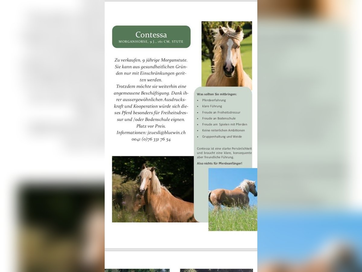 Tolle und sehr fleissige Stute mit viel Begeisterung an der Zusammenarbeit. Sei dies auf langen Ausritten, Dressur oder Springarbeit, sehr gerne Bodenarbeit oder gar Zirkuslektionen, Naturhindernisse, Horse Trail, Gymkhana und vieles mehr. Immer mit Begeisterung dabei! Sicherlich jedoch kein reines Spring oder Dressurpferd. Sie ist gruppentauglich, hat ein gutes Selbstbewusstsein und wünscht sich zumindest einen Freilaufstall, noch besser gerne in Gruppe. Contessa ist eine starke Persönlichkeit, fein zu reiten an allen Hilfen und will immer gefallen. Sie wird aus erster Hand abgegeben, dies aus persönlichen Gründen einer veränderten Lebenssituation. Sie wurde mit 6 Monaten von Ihrer jetzigen Besitzerin gekauft, und wurde schonend fein ausgebildet. Contessa hat während ihrer ganzen Ausbildung und bis heute, keinerlei Unarten wie Bocken, Steigen oder Durchbrennen gezeigt. Trotzdem fehl es Ihr keineswegs an Drive, sie marschiert immer fleissig! Wir suchen für Sie Ihren Herzensmenschen, mit dem Sie durch dick und dünn tanzen darf. Kein Schulpferd!