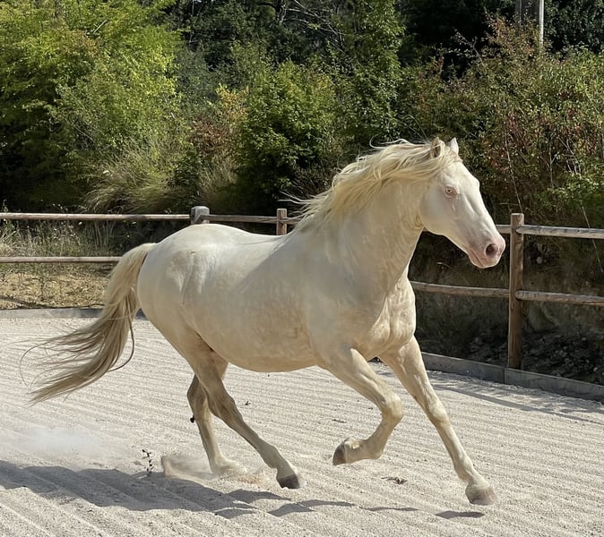 Ein Geschenk des Lebens, das den Namen Loréa Dos Prados trägt...💝 ❣️Was sie auszeichnet: Schönheit, Charisma, Subtilität, Intelligenz, Spritzigkeit, die Leichtigkeit im Umgang mit Menschen... ❣️Loréa ist eine außergewöhnliche Stute, auf der Suche nach ihrem menschlichen Herz, der/die in ihr das wunderbare Wesen erkennen kann, das sie ist. Die Schöne strebt nach einer besonderen Verbindung zu ihrem Menschen, ganz bewusst, für ein Leben voller Erfahrungen und geteilter Liebe. ❣️Loréa wurde am 19. Februar 2021 geboren und hat Papiere als OC. Sie ist die Tochter von Romane (Foto unten), einer Hispano-Araber-Stute (mit vollem Namen Romance) von Djebel Des Balmes (AB), und von Sénador Dos Prados (Foto unten), einem pp Crème Hengst mit lusitanischer Herkunft, der 2008 und 2009 französischer Meister der 2- und 3-Jährigen und 2010 Vize-Meister der männlichen Crème-Rasse war. ❣️Sie misst 1,60 m und hat ein wunderschönes kupferfarbenes Palomino-Fell. Sie hat einen harmonischen Körper und schöne, weitläufige und elastische Bewegungen. ❣️Mit einer großen Lernbereitschaft, immer sehr neugierig und enthusiastisch, wird sie eine sehr vielseitige Stute sein. Das Anreiten wird für sie eine Formsache sein. ❣️Loréa strebt neben ihrer einzigartigen Verbindung zu ihrem Menschen ein Leben in der Herde an. Sie lebt seit jeher in der Herde, wurde von ihren Eltern erzogen und ist von ihrer Familie umgeben. ❣️Sie erhält eine sehr hochwertige Fütterung sowie regelmäßige Behandlungen in Osteopathie, energetischer Pflege und tierischer Kommunikation. Sie ist natürlich entwurmt, beschlagen und war bereits beim Zahnarzt. ❣️Wenn Loréa Ihr Herz berührt, freuen wir uns darauf, Sie willkommen zu heißen und Sie an ihrem Lebensort in der Ariège zu treffen. 🙏Weitere Informationen gerne per PN oder unter 0616824610.