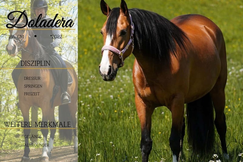 Doladera – Mare – approximately 15.8 hh (ca. 160 cm) *Doladera* is a stunning, highly versatile mare. She is incredibly calm and fearless. She moves beautifully in the arena and has three excellent gaits, all very rider-friendly. She has adapted very well to lunging on a halter. She is confident riding alone or in a group in the terrain, even in unfamiliar surroundings. Doladera crosses water, over tarps, and past vehicles and obstacles with absolute nerve and composure. She also makes a nice jump. A horse that opens all doors. Truly an all-rounder through and through. Not spooky, and she brings joy to her rider! BE SURE TO WATCH HER VIDEO! She has a stallion-like appearance and is simply stunning. In handling, she is people-oriented, affectionate, and gentle. Doladera is a dream horse in every respect. A current video can be found in the listing or at the following link: https://www.youtube.com/watch?v=UV01VwQVz7c Horse Trading Dederichs – Your Partner for Horse Buying Contact & Availability: Inquiries please exclusively by phone at 0173/9792139 Monday – Friday: 09:00 AM – 6:00 PM Saturday: 09:00 AM – 3:00 PM Sunday: Closed Follow us on social media! Experience our daily life with sale horses on Instagram, TikTok & Facebook under Pferdehandlung Dederichs Discount: Receive a 5% – 10% discount when taking your new dream horse immediately Trial Riding & Demonstration: • Trial ride: €40 per horse (up to 2 riders), fee credited upon purchase • Holidays: Trial ride €50 • Demonstration by our trainers: €30 per horse (pre-riding, groundwork, etc.) Pre-Purchase Examination & Transport: • Many of our horses already have a pre-purchase exam (AKU) • You are welcome to bring your own veterinarian • We can organize an examination for you • We are happy to assist with transport to your new home Other Sale Horses: We have additional horses available that are not yet listed online. If your dream horse is not yet among them, do not hesitate to contact us. Important Notes: • Height measurements are approximate and not precisely taken • All descriptions are subjective assessments by the seller and do not constitute guaranteed characteristics