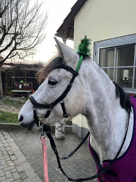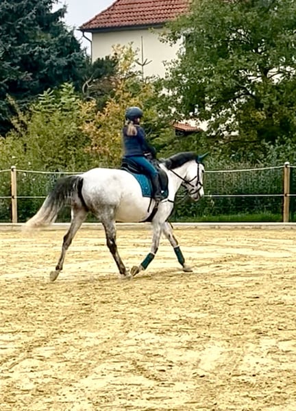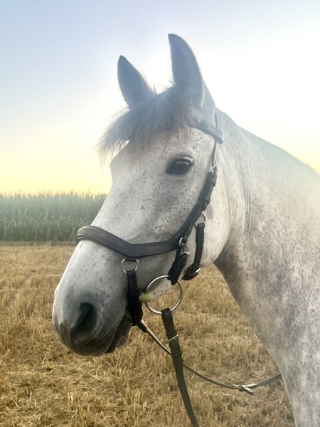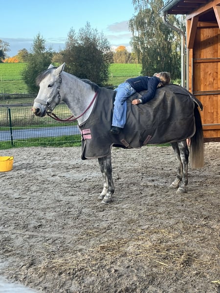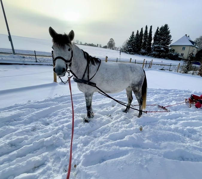 Wir suchen ein neues 5 Sterne Zuhause für unsere 9-jährige Schimmelstute. Bei uns ist sie leider aufgrund von passendem Reiter unterfordert und in ihrer Ausbildung leider noch nicht da, wo ich sie gerne hätte. Momentan wird sie von einem 7- Jährigen Mädchen frei auf dem Reitplatz Schritt und Trab und im Gelände als Handpferd mit Kind drauf in allen Gangarten geritten. Sie läuft problemlos am Fahrrad und ist im Gelände immer brav. Das Pony hat sehr viel Spaß am Freispringen ( unter dem Reiter noch nicht getestet) Sie kennt kleine Geländehindernisse an der Longe und auch Wasser ist für sie kein Problem. Siegreich in Führzügel Cross Führzügel gelaufen Wir wünschen uns für das Pony ein tolles Zuhause mit viel Auslauf und abwechslungsreicher Bewegung bei erfahrenen Pferdemenschen als Freizeitpony. Bei uns steht sie momentan in großer Paddockbox mit täglichem Auslauf, kennt aber auch Offenstall Leider hat sie anderen Pferden gegenüber teilweise eine sehr flotte Hinterhand, daher stresst sie das Turnierreiten und ich möchte sie nicht in WBO Prüfungen mit Kind vorstellen. In den letzten vier Jahren war sie bei uns nicht krank oder lahm Momentan ist sie vorne beschlagen, kennt aber auch Barhuf Für das Probereiten berechnen wir 25€ pro Reiter, um Reittourismus entgegen zu wirken. Wer Zeit, Mühe und Wissen investiert wird mit dem Pony einen guten, treuen Freizeitpartner haben. PLATZ VOR PREIS —- KEIN NOTVERKAUF