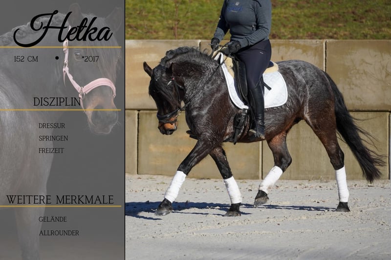 Hetka to klacz urodzona w 2017 roku, około 1,52 m wzrostu. *Hetka* to piękna i bardzo wszechstronna klacz. Świetnie się ją jeździ na ujeżdżeniu, jest lekka w kontakcie, łatwo utrzymuje zbieg i jest bardzo wygodna w siodle. Posiada ładne podstawowe umiejętności, potrafi galopować na zewnątrz, wykonywać przejścia z chodu na galop i jest przy tym bardzo zrelaksowana. Można ją również jeździć na lonży i bez siodła. Na skokach pokazuje dużo radości, a jazda w terenie w obcym otoczeniu nie stanowi dla niej problemu. Hetka przechodzi przez wodę, pokonuje przeszkody z plandekami, a także ćwiczenia na ujeżdżalni nie robią na niej wrażenia. To wymarzone konieczko! KONIECZNIE OBEJRZYJ JEJ FILM!!! W kontaktach jest bezproblemowa. Nie przegap okazji, by mieć tak wyjątkowego konia. Aktualne nagranie znajdziesz w ogłoszeniu lub pod tym linkiem: https://www.youtube.com/watch?v=RjamoBaua_E Hodowla koni Dederichs – Twój partner w zakupie konia Kontakt i dostępność: Zapytania prosimy kierować wyłącznie telefonicznie pod numer 0173/9792139. Poniedziałek – piątek: 09:00 – 18:00 Sobota: 09:00 – 15:00 Niedziela: dzień wolny Śledź nas w mediach społecznościowych! Poznaj naszą codzienność z końmi na Instagramie, TikToku i Facebooku pod nazwą Hodowla koni Dederichs. Rabat: Przy natychmiastowym odbiorze nowego wymarzonego konia otrzymujesz rabat od 5% do 10%. Próba jazdy i prezentacja: • Próba jazdy: 40 € za konia (max. 2 jeźdźców), kwota ta zostanie odliczona od ceny zakupu • Święta: jazda próbna 50 € • Prezentacja przez naszych jeźdźców: 30 € za konia (próba, praca na ziemi itp.) Badanie przedzakupowe i transport: • Wiele naszych koni ma już wykonane badanie przedzakupowe (AKU) • Oczywiście można zabrać własnego weterynarza • Chętnie zorganizujemy badanie • Pomagamy także w transporcie do nowego domu Więcej koni na sprzedaż: W naszym stajni dostępne są kolejne konie na sprzedaż, które jeszcze nie są online. Jeśli Twoje wymarzone konie jeszcze nie znajduje się w ofercie, skontaktuj się z nami. Ważne informacje: • Szacunkowe wzrosty koni nie są dokładnie zmierzone • Wszystkie opisy są subiektywnymi ocenami sprzedającego i nie stanowią gwarancji cech konia