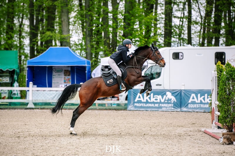 For sale is a beautiful Wielkopolska mare, born in 2016. She is a dark bay, standing at 16.1 hh. Excellent for show jumping, well-schooled in dressage. She can perform lateral movements, piaffe, passage, etc. Perfect for riders looking to introduce a horse to jumping classes up to 120 cm, with potential for more. Currently ridden by an amateur junior rider, whom she has helped transition from ponies to competing in novice level show jumping. She has experience in CSI-level competitions. As a young mare, she earned medals in free jumping and mare’s endurance tests. Please contact us to arrange a viewing and a test ride!