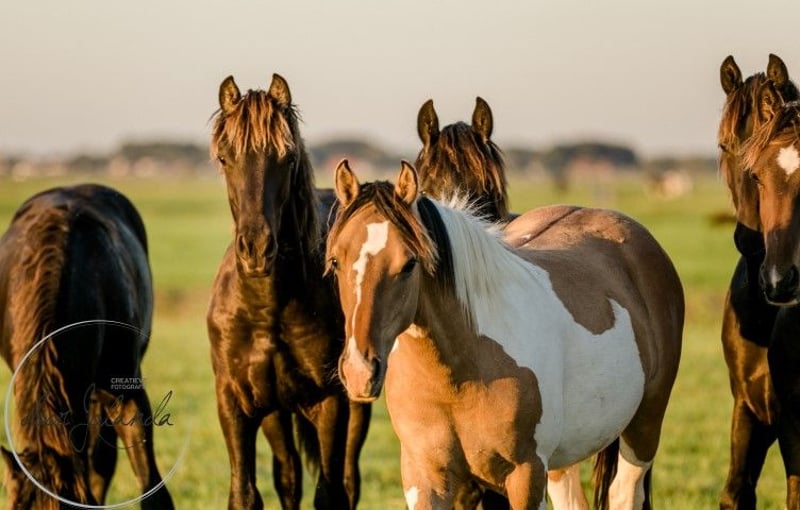 This young man is truly something special to see! He is a beautiful dunskin (3-colored) with dorsal stripe and really beautifully marked. A real eye-catcher. He is looking for a nice, sweet carrot giver. We don't know exactly his parentage. Probably German Riding Pony x Barock pinto x Fjord. We estimate that he will grow to a height of around 1.50 to 1.55m. He knows the most important thing in horse life: the herd ABC. We only breed and do not train, so all our horses are still completely green and not yet used to the halter. The big advantage is that the horses are well socialized in the herd, have not had any bad experiences and you can teach them everything you want. Our horses have and give a lot of confidence and learn quickly. Every year we have approximately 40 beautiful Barock Pinto and Frisian foals for sale from our family stud farm in the Netherlands. And also older horses (0-13 years), all still green and untrained. We breed mostly without Studbookpapers, to keep the horses affordable. You will certainly find your dream horse with us. Our horses grow up very naturally in large herds and are therefore very well socialized. Here they lead a dream horse life: in large meadows in spring and summer. In winter in large group stables. A good character, cool, strong, healthy and sweet are important requirements for us in breeding. You will find us in Tzummarum, near Leeuwarden and we will be happy to meet you. Contact: it is best to call or via Whatsapp.
