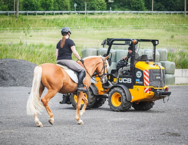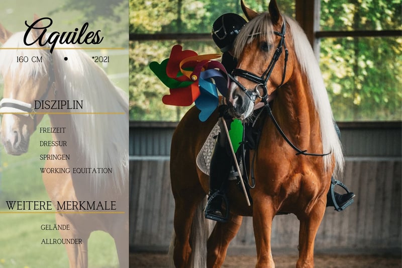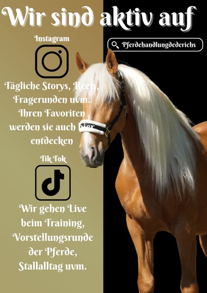 Im Kundenauftrag: Palomino Wallach, geb. 2021 ca. 1,62cm *Aquiles* Traumhaft schöner Wallach der absolute cool und unerschrocken ist. Er geht schön in Bahn und Gelände ist super weich zu sitzen und hat viel Ausdruck. Er bewegt sich dazu schön, ist eher gemütlicher als zu flott, arbeitet aber gerne mit. Er ist für sein Alter wirklich schon mehr als verlässlich und ausgeglichen. Mit Hilfe auch sicher für schwächere Reiter und Jugendliche gut geeignet. Im Gelände ob alleine oder in der Gruppe super unkompliziert. Verkehr, Lärm, Gelassenheitstraining und Trubel machen ihm nicht aus. !!! SCHAUEN SIE SICH UNBEDINGT SEIN VIDEO AN !!! Er macht viel Freude und vermittelt ein sicheres Gefühl. Im Umgang total Menschenbezogen und liebt es Aufmerksamkeit zu bekommen. Ein Traumpferd in allen Hinsichten. Ein aktuelles Video finden Sie hier in der Anzeige oder unter folgendem Link: https://www.youtube.com/watch?v=TJ6o4Of8RAA Pferdehandlung Dederichs – Ihr Partner für den Pferdekauf Kontakt & Erreichbarkeit: Anfragen bitte ausschließlich telefonisch unter 0173/9792139 Montag – Freitag: 09:00 – 18:00 Uhr Samstag: 09:00 – 15:00 Uhr Sonntag: Ruhetag Folgen Sie uns auf Social Media! Erleben Sie unseren Alltag mit den Verkaufspferden auf Instagram, TikTok & Facebook unter Pferdehandlung Dederichs Rabatt: Bei sofortiger Mitnahme Ihres neuen Traumpferdes erhalten Sie zwischen 5 %– 10 % Rabatt Probereiten & Vorführen: • Probereiten: 30 € pro Pferd (max. 2 Reiter), Betrag wird beim Kauf angerechnet • Feiertage: Proberitt 50 € • Vorführung durch unsere Bereiter: 25 € pro Pferd (Vorreiten, Bodenarbeit etc.) Ankaufsuntersuchung & Transport: • Viele unserer Pferde besitzen bereits eine AKU • Sie können selbstverständlich Ihren eigenen Tierarzt mitbringen • Gerne organisieren wir eine Untersuchung • Wir unterstützen Sie auch gerne beim Transport ins neue Zuhause Weitere Verkaufspferde: In unserem Stall stehen weitere Verkaufspferde, die noch nicht online sind. Falls Ihr Traumpferd noch nicht dabei ist, zögern Sie nicht, uns zu kontaktieren. Wichtige Hinweise: • Stockmaß-Angaben sind geschätzt und nicht exakt nachgemessen • Alle Beschreibungen sind subjektive Einschätzungen des Verkäufers und keine zugesicherten Eigenschaften Weitere Informationen finden Sie unter: www.Pferdehandlung-Dederichs.de