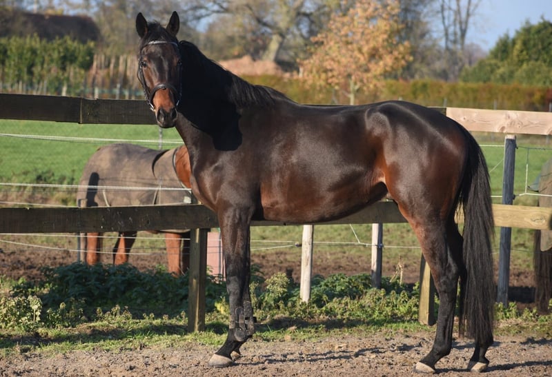 Stunning, incredibly well-behaved, and correct riding horse ruin This native-born French horse is named Daytona Diamond. His previous owner kindly entrusted him to us. He is truly a sight to behold, both inside and out! He is a natural galloper. He has never raced and has never been on a racetrack. He has three very spacious, well-animated gaits. Suitable for multiple disciplines. In our opinion, also gentle enough for recreational riding! We were able to ride him immediately upon arrival. He was born on February 21, 2022, and currently stands around 16.1 hh. He has a full pedigree: Cloth of Stars x Montjeu x Eagle Eyed. Diamond is what you would call a stunning parade horse, waiting for a kind owner with whom he can have a wonderful future! His previous owner would like to stay in contact with the new owner and writes: “Diamond is eager to learn, sweet, a cuddly horse, people and horse-oriented, social, well-behaved, and he loves grooming and attention. The reason for selling is that four horses are simply too many. He deserves more attention and riding.” He is very well-behaved when ridden outdoors here. He confidently leaves the yard alone and heads out onto the street, very calm. Recently treated by the dentist and comes with a recent report. Price €6,450 including brand-name saddle and complete bridle.