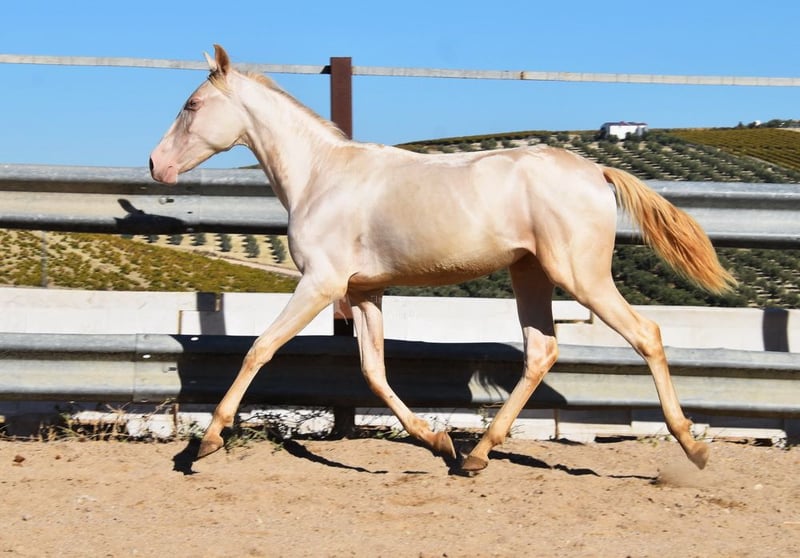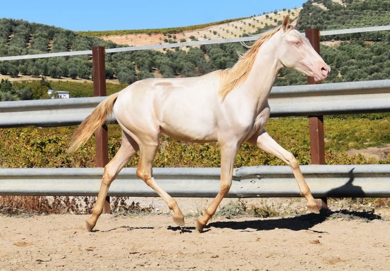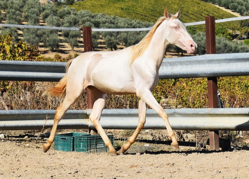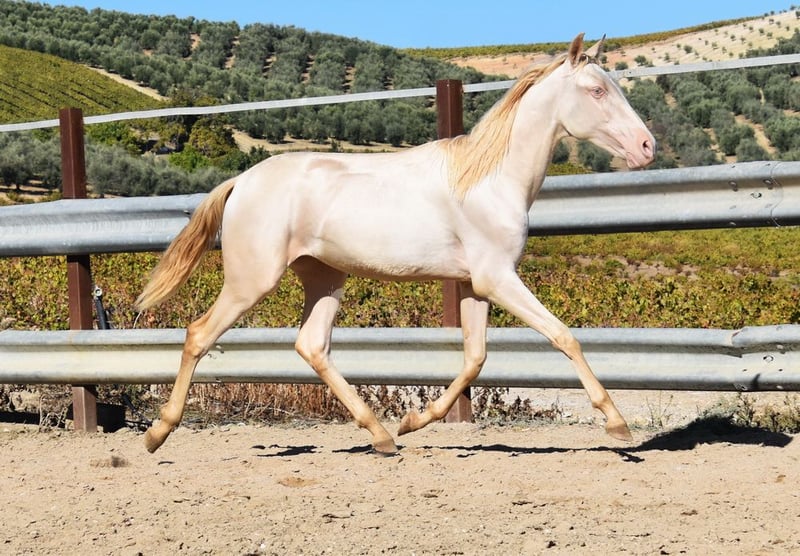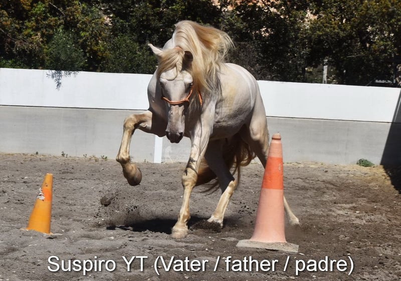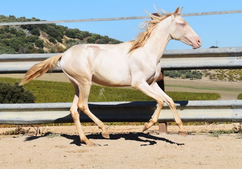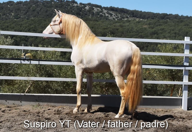 Sweet temperament, curious, affectionate, people-oriented, rough, outside with other foals, good movement and pedigree, unique color, PRE Perlino (CrCr) with papers, Piro + Arteritis negative. Pedigree includes Alquilino Moya, Yeguada el Bayo, Señoria de Bariain, Bohorquez. Great-grandfather Redondo VII and great-great-grandfather Gaucho III are qualified. www.elegante-andalusier.com