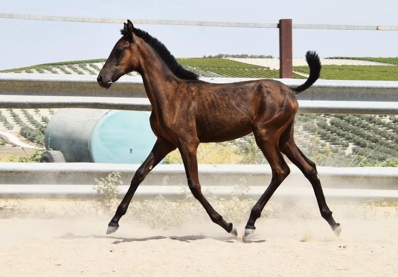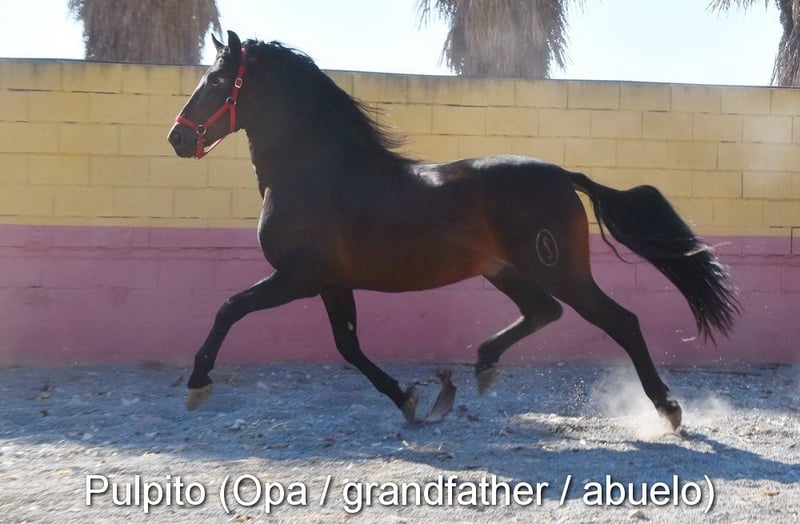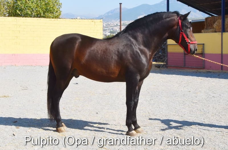 carácter amable, en estado bruto, está con su madre y otras yeguas y potros afuera, grande, buenos movimientos, color especial, negro con gen PRL, ascendencia: Juan Antonio Fernández Vargas, Yeguada Arenosas, Yeguada Militar, bisabuelo Sentado está calificado.