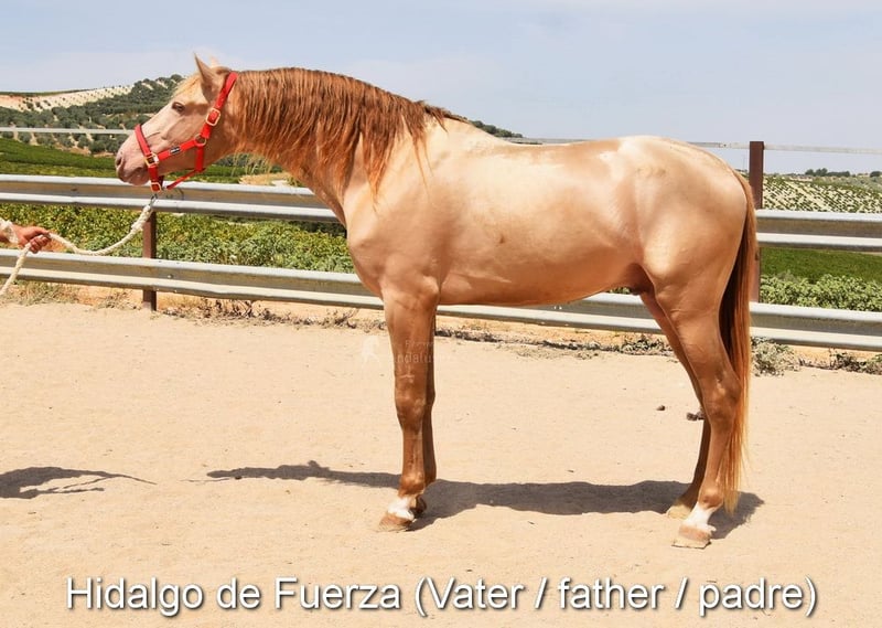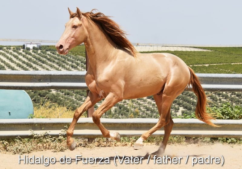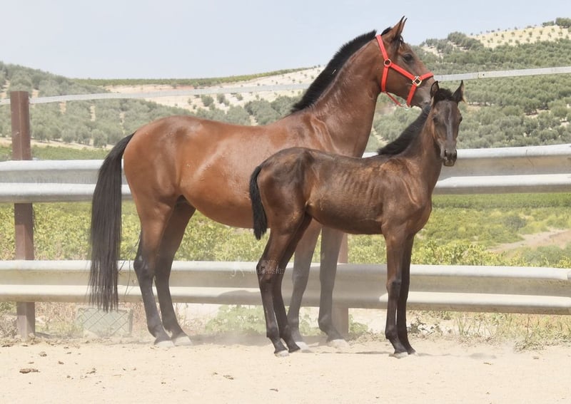 lieber Charakter, roh, steht mit ihrer Mutter und anderen Stuten und Fohlen draußen, groß, gute Bewegungen, spezielle Farbe, Rappe mit PRL-Gen, Abstammung: Juan Antonio Fernandez Vargas, Yeguada Arenosas, Yeguada Militar, Uropa Sentado ist qualifiziert