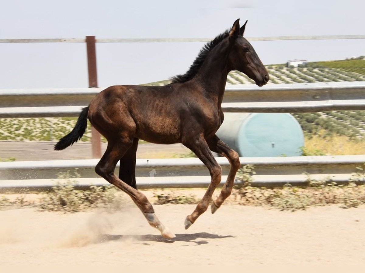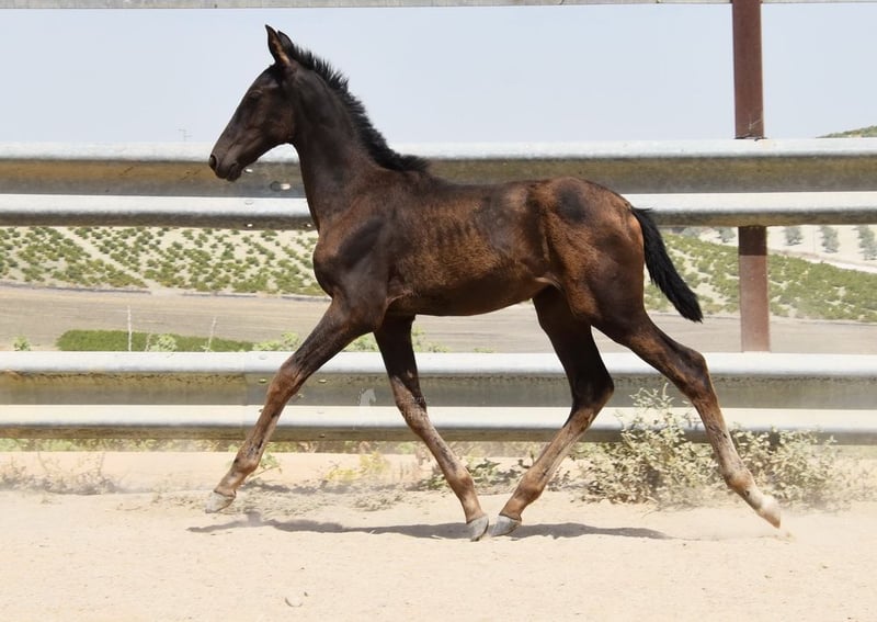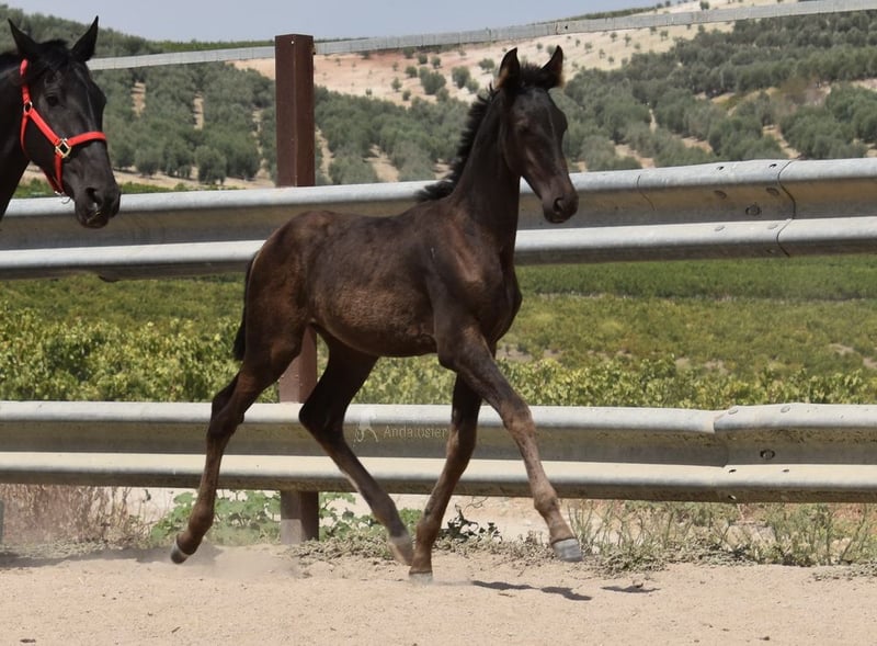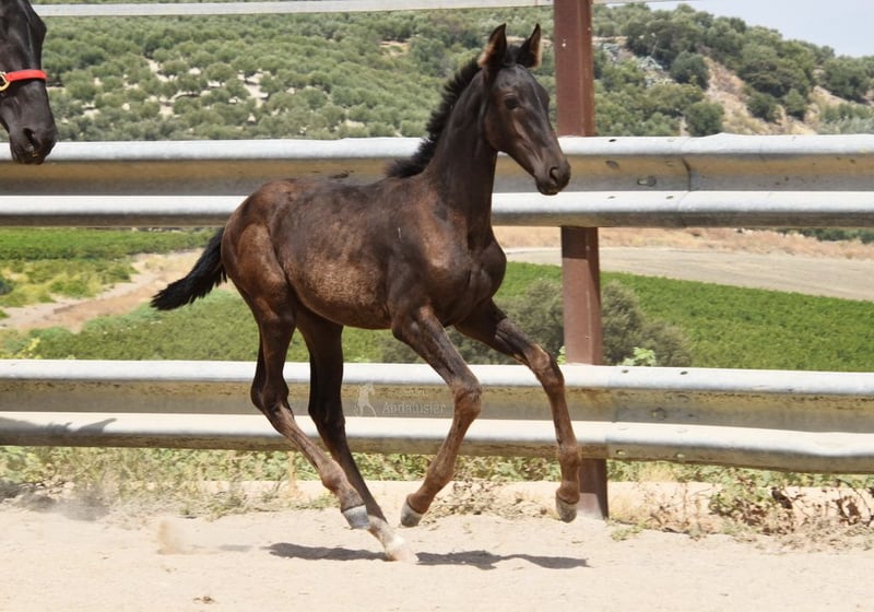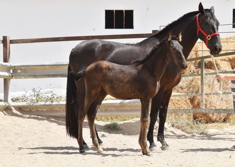 Sweet temperament, raw, currently outdoors with her mother and other mares and foals. Tall, good movement, unique color—a black mare with cream gene. Pedigree: Juan Antonio Fernandez Vargas, Yeguada Jose Luis Rodriguez Ramirez, Escalera. Great-grandfather Dominante XVI is licensed. www.elegante-andalusier.com