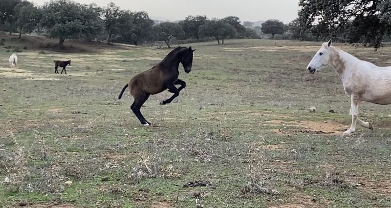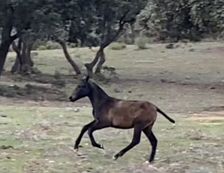 Te koop staat dit prachtige PRE merrie, die op de uitgestrekte weiden van de Yeguada Yedra in de omgeving van Málaga is opgegroeid. Ze is volledig gezond en zonder gebreken. We hebben haar zelf met de trailer van de fokkerij gehaald, wat probleemloos ging. Ze leert zeer snel, waardoor ze al heel goed te hanteren is. Ze is bekend met halsters, het geven van hoeven, en is lief tijdens het hoefverzorging. Ze volgt haar mens en laat zich goed leiden. Haar exterieur is onberispelijk. Op dit moment is ze achteraan erg lang, maar dat beïnvloedt haar uitstraling tijdens het bewegen niet. Ze staat nog vrij onderaan in rang, past zich snel aan en is gewoon ontzettend lief. Geen duwgedrag of slecht gedrag tegenover mensen. Omdat ze nog vrij groot wordt, heb ik besloten haar te verkopen. Ze heeft veel Escalera-bloed en is ook zeer interessant voor de fokkerij. Op de laatste foto's zie je haar met haar moeder op de grote weiden. De laatste foto's tonen ook haar vader.