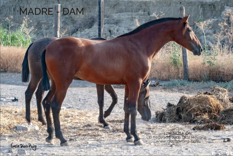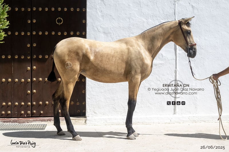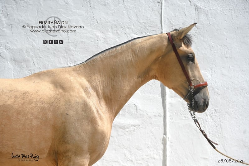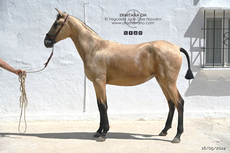 ¡Oportunidad de adquirir una hermosa y prometedora yegua! https://diaznavarro.es/ermitana-dn Se vende yegua PRE de excelente genética, nacida en el año 2024. De color bayo, con un alzada de 163 cm, ideal para quienes buscan un ejemplar de calidad y belleza. Proveniente de una línea de ganadería reconocida, esta yegua combina elegancia, fuerza y carácter. Perfecta para la cría, doma o competición, su temperamento y conformación la hacen una opción muy interesante para cualquier jinete o criador. Capa genética (genotipo): ggAAEeCCrNN Doma: doma de cuadra. Comentarios: noble y movida. Puede dar crías de capa castaña, baya, palomina, alazana, perlino, cremello, bayo perla, palomino perla y tordo. Líneas: Divo, Norte A, Velero XI, Deco, Llamativo II, Colombiano III. Yeguada Militar, Vizconde de la Montesina, D. Benito Zoido, Paco Marti. No dudes en contactarnos para más información y concertar una visita. ¡Una oportunidad que no querrás dejar pasar!