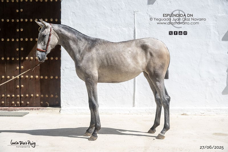 ¡Oportunidad de adquirir una bella y prometedora yegua! https://diaznavarro.es/esplendida-dn Se ofrece en venta una preciosa PRE, de raza pura, nacida en el año 2024. Es una yegua de color tordo picazo, con un aspecto impresionante y una presencia destacada. Ideal para quienes buscan un ejemplar de calidad, con potencial para doma, monta o cría. Nació de capa castaña. Futura potra de concurso. Muy movida. Líneas: Marco Antonio, Velero XI, Deco, Llamativo II, Colombiano III. Ventura Camacho, Granda, Yeguada Militar, Vizconde de la Montesina, Fernández Daza, Urquijo, D. Benito Zoido, Bohorquez. No pierda la oportunidad de conocerla y valorar todo su potencial. Para más información, no dude en contactarnos.