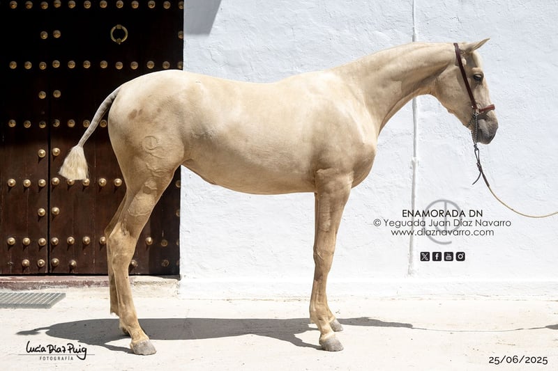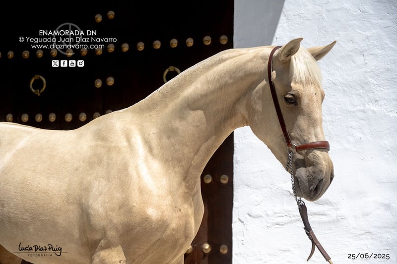 ¡Oportunidad de adquirir una potra con una capa espectacular y un físico increíble! https://diaznavarro.es/enamorada-dn Se vende preciosa yegua de raza PRE, nacida en el año 2024. De color palomino, con un pelaje brillante y llamativo. Tiene una alzada de 165 cm, ideal para diferentes disciplinas y actividades ecuestres. Esta ejemplar proviene de una excelente genealogía, garantizando calidad y potencial para futuras competencias o para uso en la reproducción. Es una yegua con carácter equilibrado, apta tanto para jinetes experimentados como para quienes desean iniciarse en el mundo del caballo. Capa genética (genotipo): ggAaeeCCrNN Alzada: 1’56m a la cruz (25/06/2025) Comentarios: añoja con mucho potencial, pudiendo dar crías de todas las capas menos las isabelas. Líneas: Divo, Norte A, Cepellón, Velero XI, Lego, Lebrijano III, Bizarro XIV, Llamativo II. Yeguada Militar, Vizconde de la Montesina, D. Benito Zoido, Paco Marti. No pierda la oportunidad de incorporar a su familia o finca una yegua de gran calidad y belleza. Para más información y consultas, no dude en contactarnos.