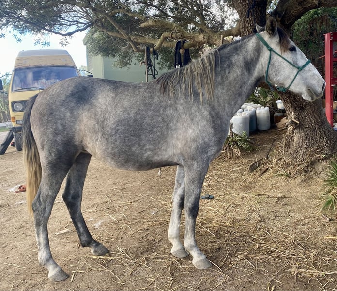 Esta hermosa y muy cariñosa yegua PRE está en venta, ya que voy a quedar demasiado pesado para ella. Lamentablemente, porque es una yegua robusta, pequeña, compacta y de tipo baroque, que aprende muy, muy rápido y será la mejor amiga de alguien, ya que es muy afectuosa y necesita cariño. Cumplirá tres años en marzo. Después de solo dos paseos, ya confiaba plenamente en mí, y tras dos sesiones de manejo con cuerda, ya pude trabajar con ella en libertad. Seguimiento libre, trotar hacia mí, y trotar y caminar en círculo sin cuerda. Todo muy dócil y amigable. También se puede tocar en cualquier parte y no hay problema con el cuidado de los cascos. El galope es con rebote. Es adecuada para jinetes ligeros o niños muy cariñosos. No es apta para reproducción, ya que sufrió un edema en la ubre debido a una garrapata. Actualmente vive con su media hermana y cuatro machos en un paddock de 5 hectáreas con pasto.