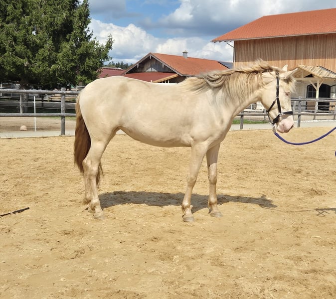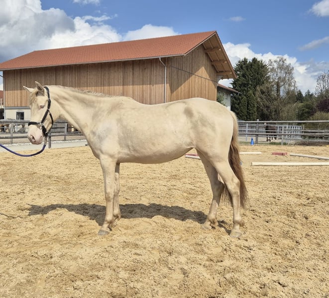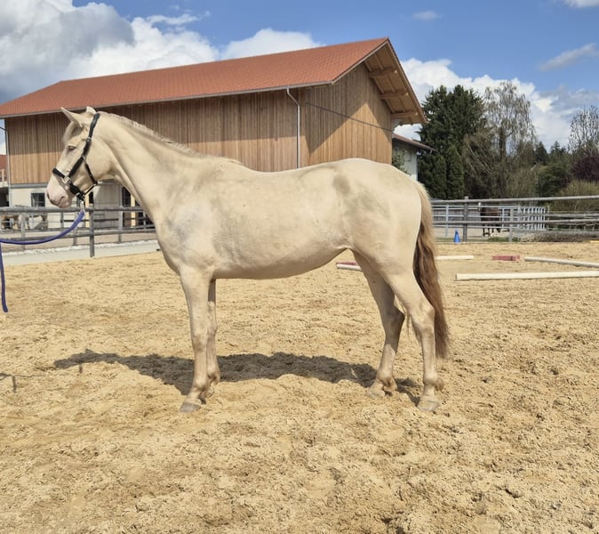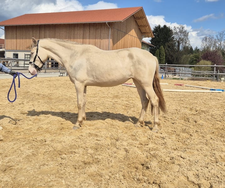 Zum Verkauf steht eine bildschöne PRE-Stute in der Sonderfarbe Baya Perla. Diese elegante im Jahr 2023 in Spanien geborene Stute überzeugt durch ihr freundliches Wesen und ihre beeindruckende Erscheinung. Mit einem aktuellen Stockmaß von 152 cm ist sie ideal für Freizeitaktivitäten geeignet und zeigt sich vielseitig talentiert. Risueña wurde mit ihrer Mutter in Spanien gekauft und kam vor zwei Jahren zu uns. Da der PRE ein Spätentwickler ist, wird sie im Laufe der Zeit noch größer und breiter. Obwohl sie aus etwas schlechteren Bedingungen stammt, ist sie wahnsinnig Menschenbezogen, verschmust und neugierig. Da sie in Spanien aber so gut wie keine Erziehung genossen hat, braucht sie jemanden der sich durchsetzten kann und ihr auch mal zeigt wo es lang geht, ihr aber trotzdem noch genug Zeit lässt. Sie wächst seit dem sie bei uns ist artgerecht im Herdenverband auf und kennt Hufschmied sowie Tierarzt. Risueña kann man überall ohne Probleme anfassen, alleine aus der Gruppe nehmen und die Anfänge des Longierens beherrscht sie auch schon. Für die schöne Stute wünschen wir uns einen liebevollen Menschen mit viel Pferdeerfahrung, der ihr noch genug Zeit bei ihrer körperlichen Entwicklung gibt und sich durchsetzt. Bei Interesse oder für weiter Informationen stehe ich gerne zur Verfügung. Eine Besichtigung und Kennenlernen der Stute ist nach Absprache möglich.