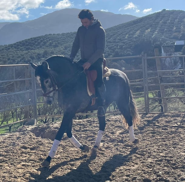 For sale is this charming 3-year-old PRE mare with an approximate height of 15.5–15.6 hh and an excellent pedigree, descending from the lines of Fco. Santiago y Escalera as well as maternal Peralta. She impresses not only with her typical, elegant appearance but especially with her exceptionally good temperament. For her age, she is completely reliable, balanced, and very well-behaved both in handling and under saddle. The mare has been lovingly trained in all three basic gaits, responds beautifully to subtle aids, and listens very well to voice commands. Thanks to her intelligence and calmness, she can even be ridden without a bridle, which highlights her trusting and cooperative nature. Therefore, she is also very suitable as a beginner or riding school horse, although some additional time should be allowed for further physical growth and development due to her age. In daily handling, she always appears friendly, human-oriented, and uncomplicated. A mare that brings joy, trust, and with whom one can work together calmly and confidently. X-rays are available. Please feel free to contact me with videos if genuinely interested.
