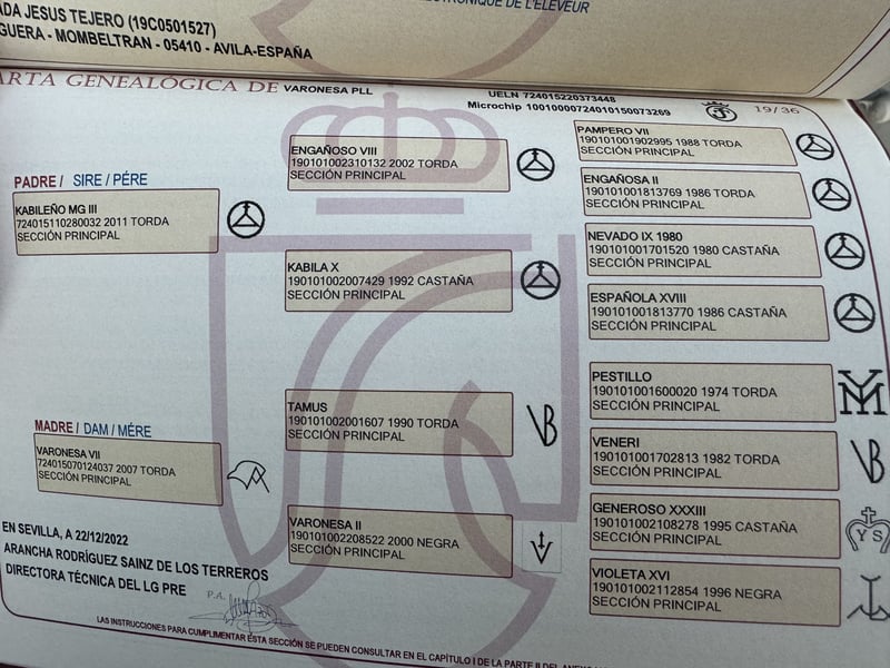 Esta joven yegua PRE con la mejor genética roza la perfección sólo por su aspecto: una conformación maravillosamente equilibrada con un gran cuello, una línea superior perfecta y una base sólida dan una idea a primera vista de que es hija de padres muy premiados. No es casualidad que la joven VARONESA ya haya brillado en varias exposiciones de cría. En la actualidad, su propietario la está domando y muestra una excelente conformación: es fiable, dispuesta a trabajar y siempre tiene la cabeza despejada. VARONESA procede de una yeguada pequeña con el mejor programa de cría. Naturalmente tiene todos los papeles de la ANCCE. Ubicación España.