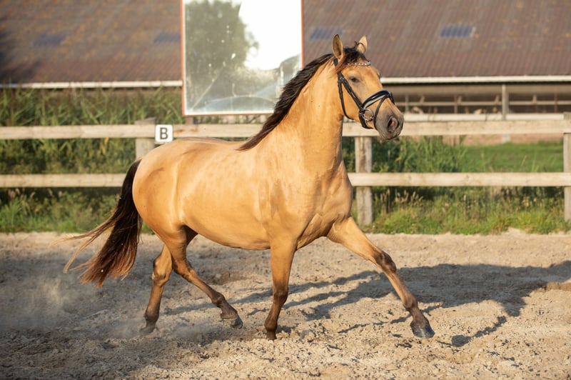 ✨ Beautiful mare born in 2022 with a golden temperament and presence ✨ This sweet and willing PRÉ mare is a true eye-catcher, not only because of her distinctive golden appearance but also due to her lovely character. She currently measures approximately 1.61 m, and given her young age, she is expected to grow a little more. Her sire is Mar Wonderful, and she has good paperwork. The mare holds a Carta. She is saddle-trained, responds well to work, and is honest and well-behaved. The rider in the photo is 14 years old, which further highlights her reliable and gentle nature. We are currently continuing her training at a relaxed pace. She is traffic-safe, sensible, and level-headed, and has already been on several outdoor rides, which she clearly enjoys. Thanks to her calm, social, and cooperative temperament, she is also very suitable as a therapy or coaching horse. The mare is easy to shoe, has recently seen the dentist, receives regular deworming, and her vaccinations are fully up to date. She has been raised in the Netherlands since foalhood. She is social and friendly towards other horses and gets along well with both mares and geldings. Last summer, she spent day and night outside in a herd. Additionally, she comes with a genetic color analysis report and is in foal to the beautiful stallion Sonador PT. She is due in early May and is carrying a pearl-gen foal, making her even more special. ✔ Versatile for various disciplines ✔ Well-behaved, sensible, and willing ✔ Healthy with no flaws An honest mare with great potential for sport, recreation, breeding, or coaching. ✔ Clinically approved in January 2026 Please only respond if you are genuinely interested! Price is for mare with foal.