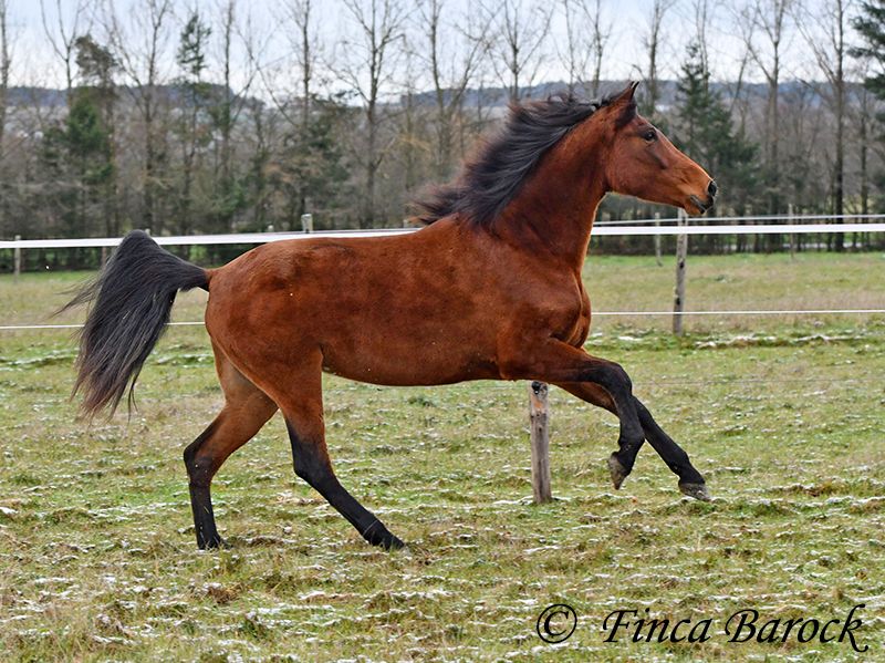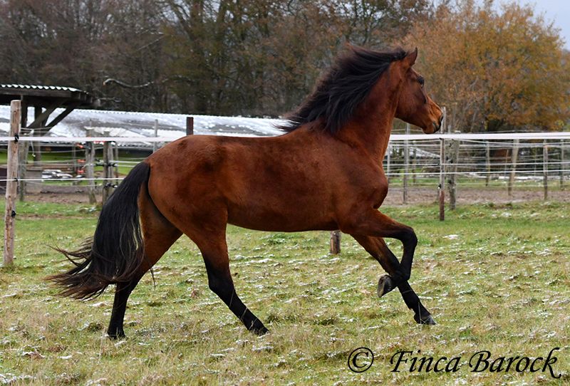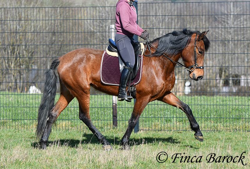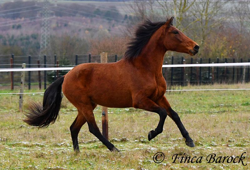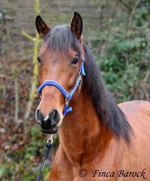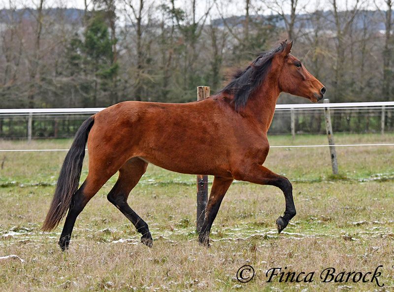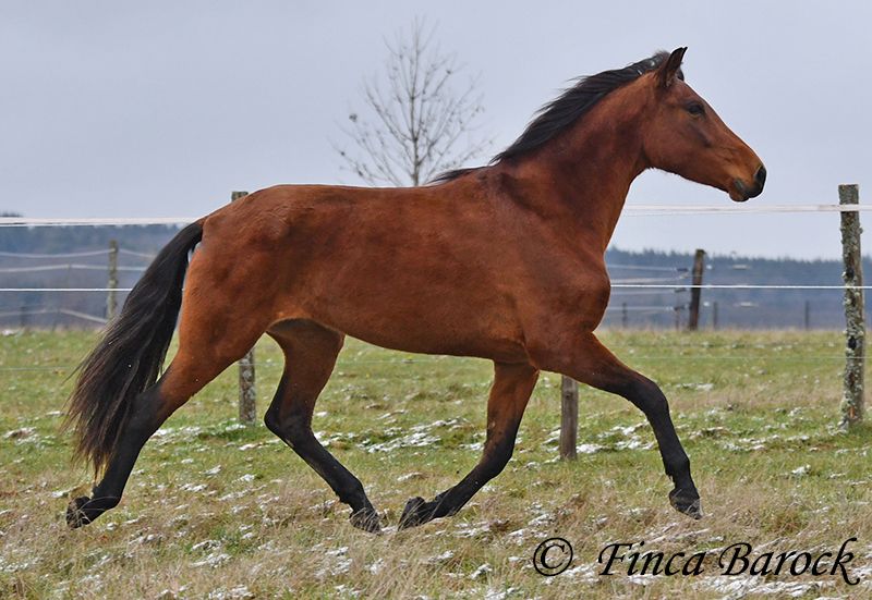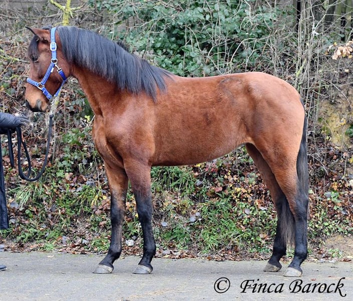 Breed: PRE Name: Caprichosa CDXV Gender: Mare Height: 1.60 m Date of Birth: March 8, 2021 Color: Brown Price: €8,000 Sire: Malevolo del Pas by Cubanon (Joven Reproductor) out of Ermitaño III (Majorante + Elite) Dam: Temprana Noble by Indiano LVI Caprichosa is a lovely, slender, and expressive mare with a friendly temperament. She was purchased to be used as a broodmare. However, life sometimes takes unexpected turns, and her owner’s plans could not be realized due to personal reasons. During the summer, the sweet Caprichosa enjoyed time on the pasture and was only ridden occasionally. Currently, she is being retrained with us. Under saddle, she proves to be eager to work, comfortable in the seat, diligent, and quick to learn. Caprichosa has been ridden in the arena and is also familiar with trail riding. She is attentive, briefly surveys new surroundings, but is then easily convinced to continue. Overall, she prefers outdoor riding over arena work and feels completely at home in the terrain. She has a spacious, expressive trot and a fantastic uphill canter. Her movements are characteristic and seat-friendly. She also shows willingness to jump small obstacles and could be versatile in her training. A wonderful mare with solid foundations, ready for new adventures! Contact: Finca Barock, Tel. 0173-696 31 81, 56291 Wiebelsheim