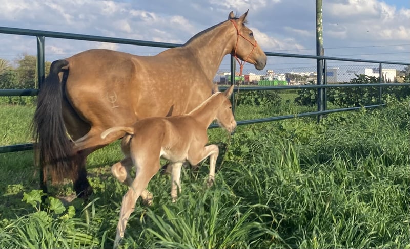 Doskonała klacz Baya w ciąży po ogierze Palomino, wnuku Simpático de Millán III, Improver Breeder. Wspaniała okazja, aby kupić klacz do hodowli lub sportu i cieszyć się jej wyjątkową szlachetnością, pięknem i wspaniałą genetyką.