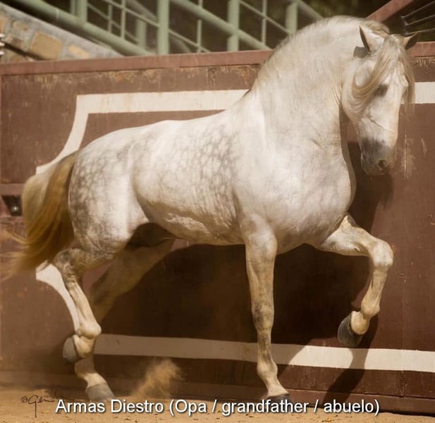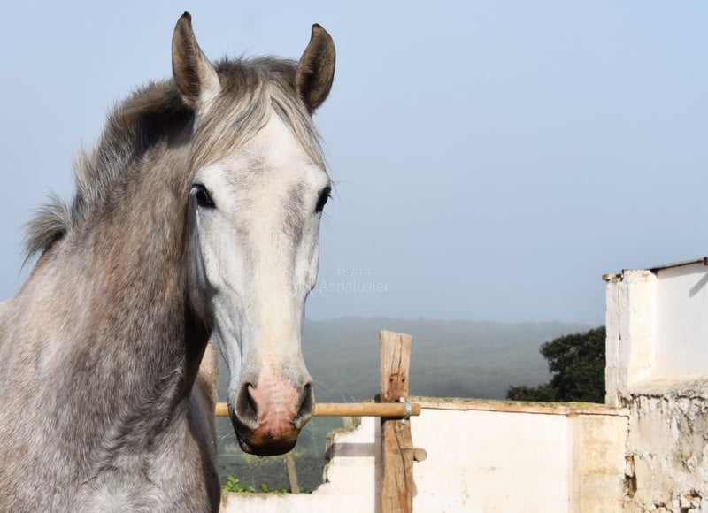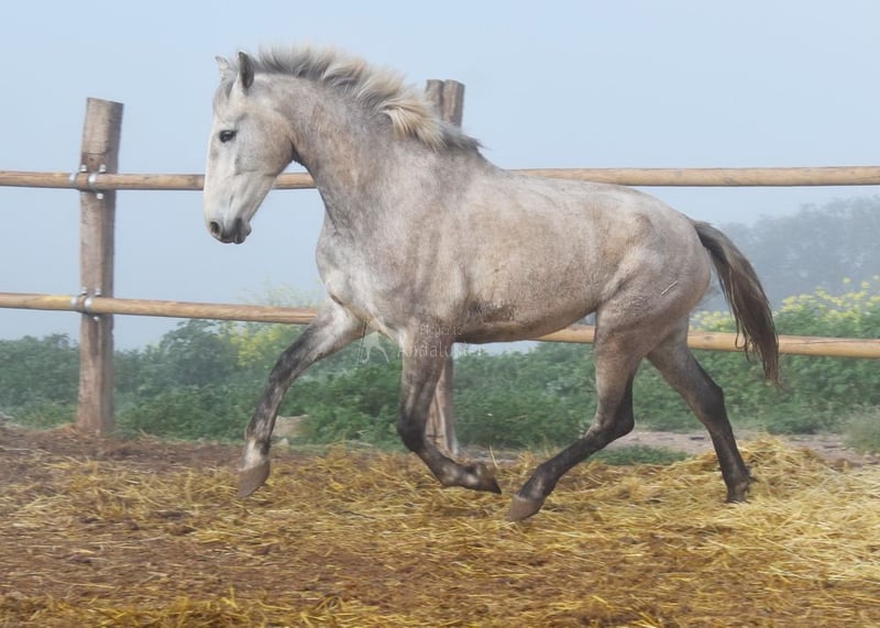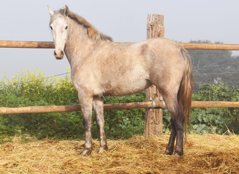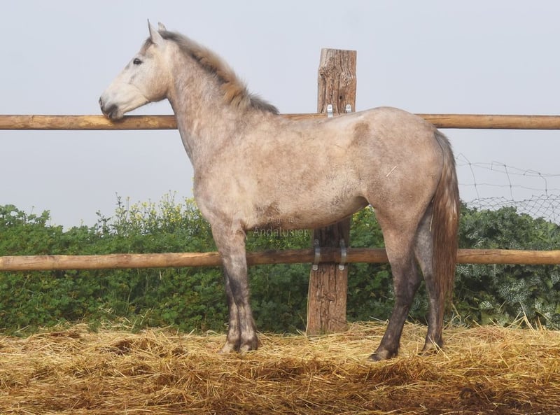 caractère aimable, curieux, sociable, brut, longé, vit dehors avec d'autres juments, grand, bons mouvements et ascendance, Ascendance : Plaza de Armas, Yeguada Militar, Yeguada Vilaire, grand-père Judio VII est qualifié www.elegante-andalusier.com