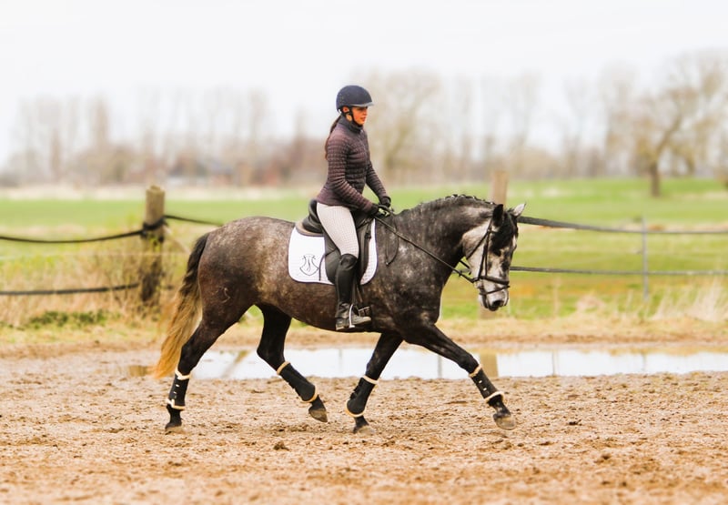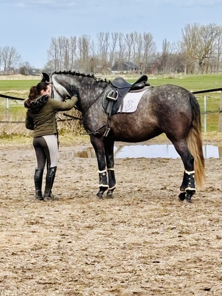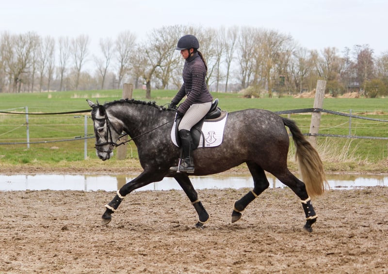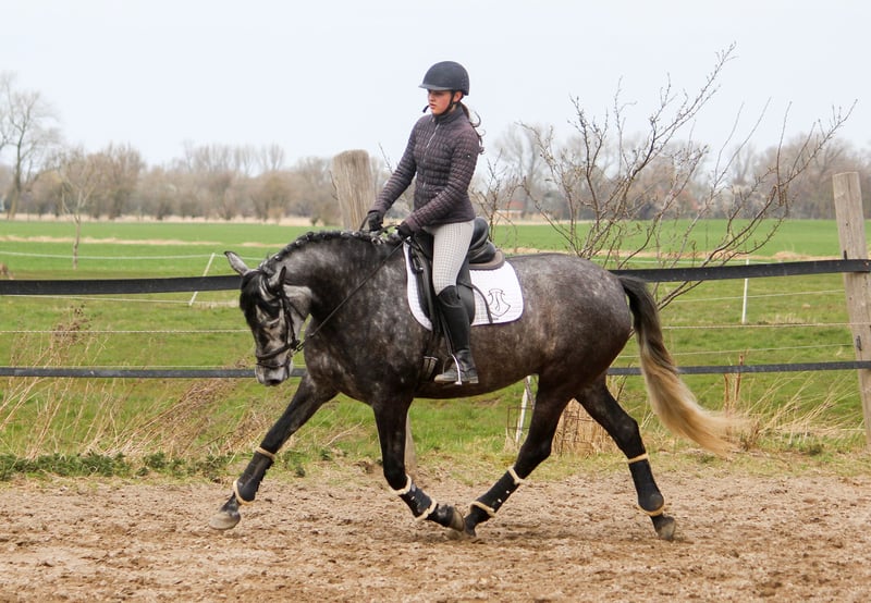 Guadalupe trabt mit einer sehr rassetypischen Mechanik. Ihre Knieaktion ist spektakulär und ist von enormer Kraft aus der Hinterhand begleitet. Das unterscheidet sie von vielen anderen PRE, die zwar Knieaktion zeigen, denen aber "der Motor" fehlt. Unter dem Sattel ist sie sehr arbeitseifrig. Sie ist feinfühlig und lernt sehr schnell. Sie ist derzeit noch sehr übereifrig im Viereck. Im Gelände dagegen ist sie entspannt und nicht schreckhaft. Guadalupe verfügt über drei sehr gute Grundgangarten. Sie ist eine große, kräftige Stute mit gutem Fundament. Die Stute kommt aus unserer sportbetonten PRE Zucht in Norddeutschland. Auch ihr Vater und ihr Großvater haben überdurchschnittliche Bewegungen. Guadalupe ist freundlich im Umgang. Sie ist nicht ängstlich oder kompliziert. Der Vollbruder von Guadalupe hat auf FN Turnieren bei 11 Starts im ersten Jahr, 9 Platzierungen erhalten. Guadalupe ist eine sensible Stute, sehr fein am Bein und etwas übereifrig. Sie lernt sehr schnell. Man könnte sie sich wunderbar in der Working Equitation vorstellen. Sie bringt die nötige Wendigkeit und Kraft mit. Außerdem ist sie prädestiniert für feine Hilfen. Sie ist also ein Pferd für Menschen mit Spaß an spritzigen, aber dabei grundehrlichen Pferden. Guadalupe ist in Deutschland geboren und aufgewachsen. Sie ist daher Piroplasmose frei und auch an 24 Stunden Weidegang gewöhnt.