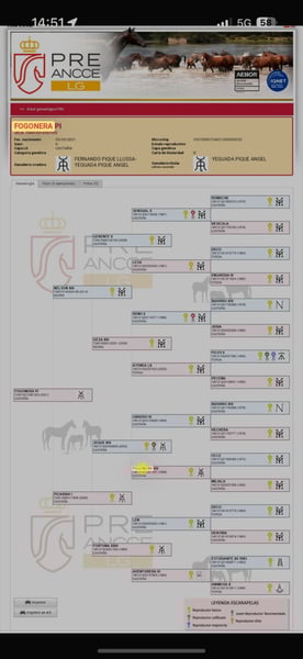 Preciosa potra PRE, con pasaporte PRE, de 5 años de edad, con nivel 2 de doma. Súper carácter en pista con más caballos, en el campo, con el herrador y con el transporte. Es muy predispuesta al trabajo y tiene mucha energía, y un súper carácter. Es una buena yegua de futuro para el deporte. Tiene radiografías OK y es negativa en Piro.