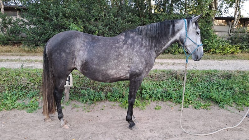 Sol (Wenne WH) ist eine 6-jährige PRE-Schimmelstute von ca. 1,55 m, derzeit in professioneller Parelli-Ausbildung bei Fien De Baere (Pony Connect - Deinze). Horsenality: LBE. Sie lernt schnell, denkt mit und bleibt emotional verfügbar.
