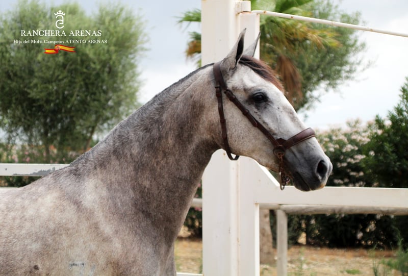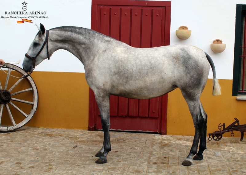 RANCHERA ARENAS è una puledra di 2 anni, figlia dello stallone pluricampione ATENTO ARENAS. È una puledra di grande genetica, molta razza e buona elevazione perché già a due anni ha 1,60 m. al garrese. Una puledra molto completa che annovera tra i suoi antenati 3 stalloni che vengono catalogati come Breeding Breeders, come DUQUE CXIII, EDUCADO X e DIGITAL. Un altro dei suoi antenati -CENTELLA V- è stato campione di Spagna nel 1984 Una linea genetica tra le più esclusive.