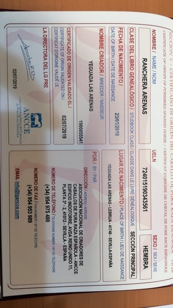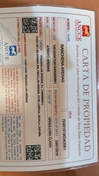 RANCHERA ARENAS is een 2-jarig merrieveulen, dochter van de meervoudig kampioenshengst ATENTO ARENAS. Het is een merrieveulen van geweldige genetica, veel ras en goede hoogte want al op tweejarige leeftijd heeft het 1,60 m. bij de schoft. Een zeer compleet merrieveulen dat tot zijn voorouders behoort met 3 hengsten die gecatalogiseerd zijn als Fokkers, zoals DUQUE CXIII, EDUCADO X en DIGITAL. Een andere van zijn voorouders - CENTELLA V - was kampioen van Spanje in 1984 Een genetische lijn van de meest exclusieve.