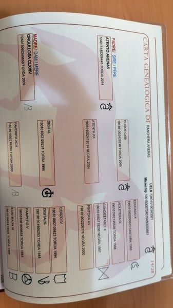 Ranchera Arenas ist ein 2-jähriges Fohlen, Tochter des Multi-Campe?n-Hengstes ATENTO ARENAS. Es ist ein Laus von großer Genetik, viel Rasse und guter Aufstieg, denn schon an seinem zwei Jahre hat sie 1,60 m am Kreuz. Ein sehr komplettes Fohlen, das zu seinen Vorfahren 3 Standard hat, die als verbesserungsfähige Zuchttiere klassifiziert werden, wie DUQUE CXIII, EDUCADO X und DIGITAL. Ein weiterer vorfahrender Vorfahre - CENTELLA V - wurde 1984 spanischer Meister. Eine genetische Linie von der exklusivsten.