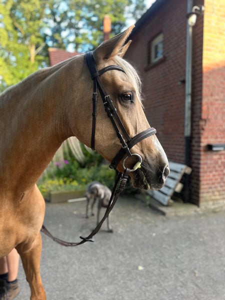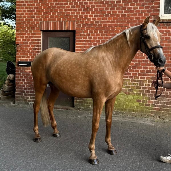 This stunning PRE mare in a special Palomino color is searching for her soulmate. She has a sweet, open, and friendly character and loves to explore new things with her human partner. She is 7 years old and approximately 16.1 hh. Her life has so far been spent in a small hobby farm herd, and she has already given birth to two healthy foals (a chestnut mare with Prl and a Cremello stallion). For this reason, she has not yet been backed under saddle, but she has always been handled from the ground, so she is familiar with human interaction and work, and she always approaches with kindness and motivation. This means she can be easily backed in her new home. In her new environment, she could be suited for many disciplines—whether continuing in breeding or dressage, working in Working Equitation, showing, or simply as a leisure partner. She spent her childhood on pasture with a large herd of mares and foals. She comes from a private owner and was intended to remain a broodmare in a small private breeding farm with a family atmosphere. Unfortunately, due to personal reasons, the family has to part with their hobby farm and this beautiful mare, and they are now looking for an excellent new home for her. Location: East Westphalia, Germany
