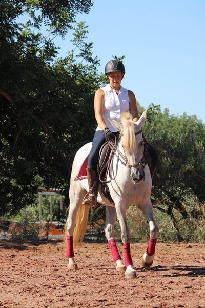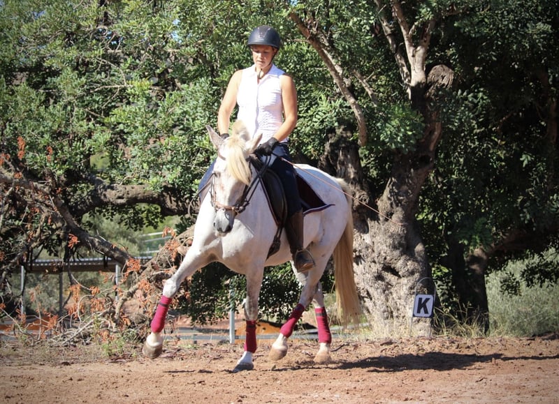 BURLONA, bei uns BELLA genannt, ist eine Barockstute wie aus dem Bildband! Ein kompaktes, ausgewogenes Gebäude, ein gutes Fundament und natürlich ihr imposanter Barockhals und ihr ausdrucksstarkes Gesicht machen sie zu einem echten Modell für die PRE als Rasse. Wie in Spanien bei den Stuten, die direkt vom Züchter kommen üblich, hat sie Mähne und Schweifansatz gestutzt. Sie ist aber keine Exzemerin und das Langhaar wächst bereits wieder nach. BELLA überzeugt zudem durch einen besonders lieben und warmherzigen Charakter. Nachdem sie nun einige Jahre in der Herde bei ihrem Züchter stand, ist sie bei mir wieder im Aufbautraining und zeigt sich geschickt, fleißig und lernwillig. Sie ist in den GGA geritten und lernt gerade Schulterherein und Schenkelweichen. Wir waren auch bereits mit ihr im Gelände, wo sie sehr sicher ist und besten mit Autos, Traktoren, Hunden etc. vertraut. Sie läuft sehr sicher und zuverlässig unter dem Reiter und gibt ein sicheres und entspanntes Reitgefühl. Keine Schimmelmelanome. Volle Papiere der ANCCE. Standort Spanien.