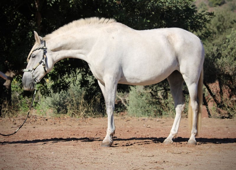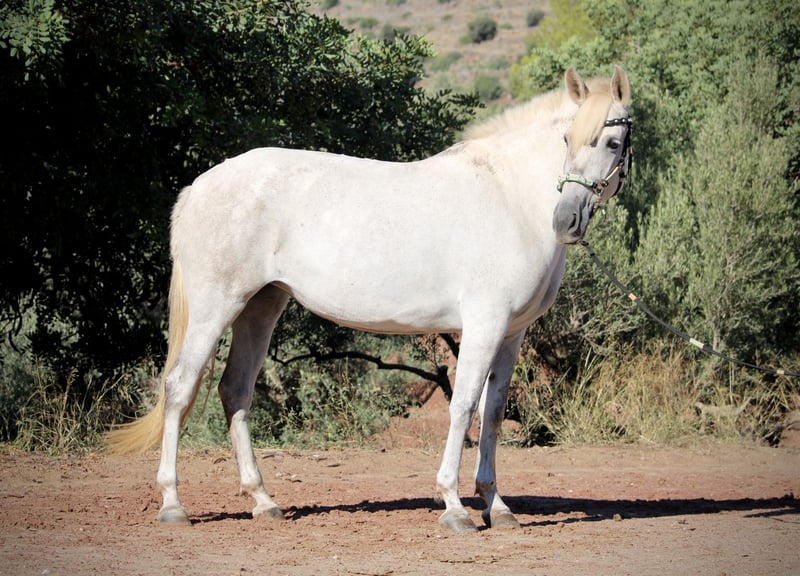 BURLONA, bij ons BELLA genoemd, is een barokmerrie zoals uit een fotoboek! Een compact, evenwichtig gebouwd paard met een goede basis, en natuurlijk haar imposante barokke hals en expressieve gezicht maken haar tot een echt model voor de PRE-ras. Zoals gebruikelijk in Spanje bij merries die rechtstreeks van de fokker komen, heeft ze manen en staartaanzet geknipt. Ze is echter geen exmoor en haar langhaar groeit al weer aan. BELLA overtuigt bovendien door haar bijzonder lieve en warmhartige karakter. Nadat ze enkele jaren in de kudde bij haar fokker heeft gestaan, is ze nu bij mij weer in opbouwtraining en toont ze zich slim, ijverig en leergierig. Ze is gereden in de algemene basisgangen en leert momenteel schouderbinnenwaarts en schouder- en flankwerking. We zijn ook al met haar in het terrein geweest, waar ze zeer zeker is en uitstekend vertrouwd met auto’s, tractoren, honden etc. Ze loopt heel betrouwbaar en veilig onder het zadel en geeft een geruststellend en ontspannen rijgevoel. Geen melanoom bij de schimmel. Volledige papieren van de ANCCE. Locatie Spanje.