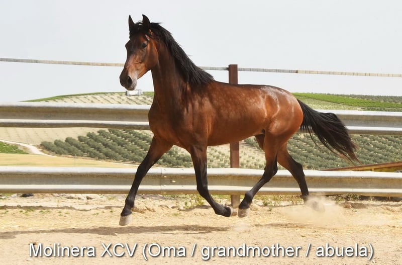 lieber Charakter, neugierig, roh, steht mit ihrer Mutter und anderen Stuten und Fohlen draußen, gute Bewegungen, spezielle Farbe, Falbe mit PRE Papieren, Abstammung: Antonio Guiral Guarga, Castillo Villafranca, Paco Marti, Pedro Carmona Aguilar www.elegante-andalusier.com