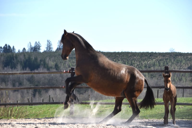Luminosa est une pouliche PRE baie née le 4 avril 2025, issue de Herrerilla Cen et par Mar Wonderful. Sa mère a été élevée par la célèbre Yeguada Centurión, fille de nul autre que le fameux Delegado Mac, avec des lignées principalement Cárdenas. Son père, notre étalon perlino Mar Wonderful, a déjà prouvé qu'il est un producteur réussi, nous donnant des poulains courageux avec de beaux mouvements. Luminosa aime le contact humain et n'est pas facilement impressionnée. Elle possède toutes les qualités pour devenir le cheval de famille parfait, que ce soit pour le dressage, l'équitation de loisir ou simplement comme un merveilleux compagnon. Elle sera fournie avec une documentation ANCCE complète. Nous pouvons également organiser des documents TRACES et organiser le transport si nécessaire. Luminosa a grandi en troupeau au pâturage, a été régulièrement vermifugée et a reçu une alimentation de haute qualité.