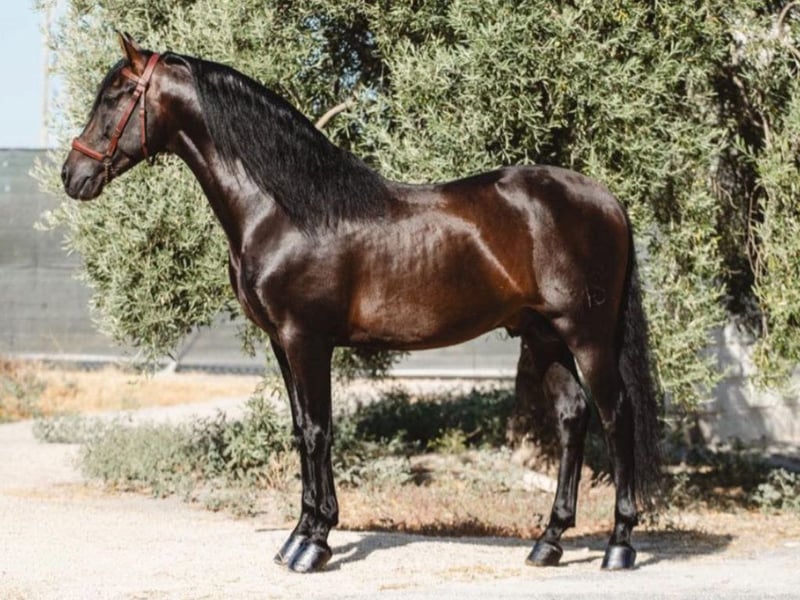 Wir präsentieren diesen attraktiven PRE, geboren 2016, mit einer Stockmaßhöhe von 1,58 m, der eine sehr interessante Kombination aus Funktionalität, bewährter Genetik und ausgezeichnetem Charakter bietet. Es handelt sich um einen sehr typischen braunen Hengst, mit ausgeprägtem Rassetyp und einer eleganten Ausstrahlung, die das klassische Bild des spanischen Pferdes widerspiegelt. Der Hengst ist aktuell bis San-Jorge-Niveau geritten und ausgebildet und verfügt über eine solide dressurmäßige Grundlage, gutes Gleichgewicht und ein klares Verständnis der Versammlungsarbeit. Besonders hervorzuheben sind seine ausdrucksstarken Bewegungen: ein klarer und taktsicherer Schritt, ein elastischer, schwungvoller Trab sowie ein ausbalancierter, leicht zu versammelnder Galopp mit guter Aufwärtsbewegung. Sein Ausbildungsstand ist besonders interessant, da alle Übungen für den schnellen Übergang in den Grand Prix bereits vorhanden sind. Ein großer Pluspunkt ist sein hervorragender Charakter. Er ist brav, kooperativ und mental sehr ausgeglichen, wodurch er für Reiter aller Art geeignet ist, einschließlich Kinder, Damen oder kleinere Reiter. Er vermittelt stets ein sicheres, angenehmes und unkompliziertes Reitgefühl, sowohl im täglichen Umgang als auch unter dem Sattel. Genetisch gesehen ist er ein Bruder des berühmten Olympiapferdes Malagueño, der international im Grand Prix erfolgreich vorgestellt wurde. Dies unterstreicht seine Qualität, sein sportliches Potenzial und seinen hohen Zuchtwert als Hengst. Röntgenbilder sind vorhanden, und der Hengst ist piroplasmosefrei. Ein rundum komplettes Pferd mit einer soliden Gegenwart und einer äußerst vielversprechenden sportlichen und züchterischen Zukunft.