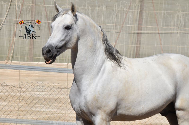 L'étalon PRE ORO KEOPS est né le 03.04.2014. C'est un amour de rêve qui est malheureusement cédé pour des raisons familiales. Il se comporte toujours correctement, n'est pas du tout docile et a un tempérament très amical. Il est issu d'un haras de première classe où il a bénéficié d'un élevage raisonnable. Il a également été correctement éduqué. Cependant, personne ne l'a monté ces trois dernières années par manque de temps. Il bénéficie donc maintenant de quelques heures de monte professionnelle en guise de rappel. Il a Bohorquez, La Cartuja, Hierro de bocado et YM dans sa lignée. C'est un superbe spécimen baroque de 1,66 m au garrot, bien mesuré.